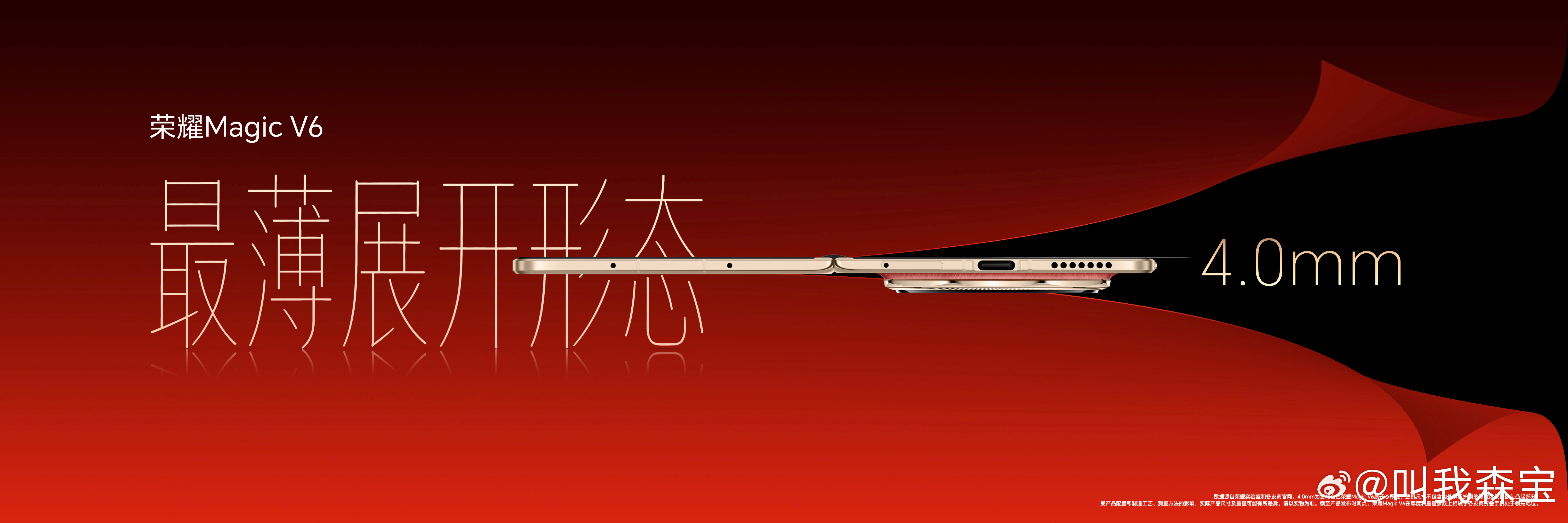 荣耀Magic V6 荣耀Magic V6折叠形态下薄至8.75毫米,轻至219g,展开状态下的厚度只有4.0毫米,是目前最轻薄的折叠屏,没有之一!荣耀MagicV6最轻薄折叠屏