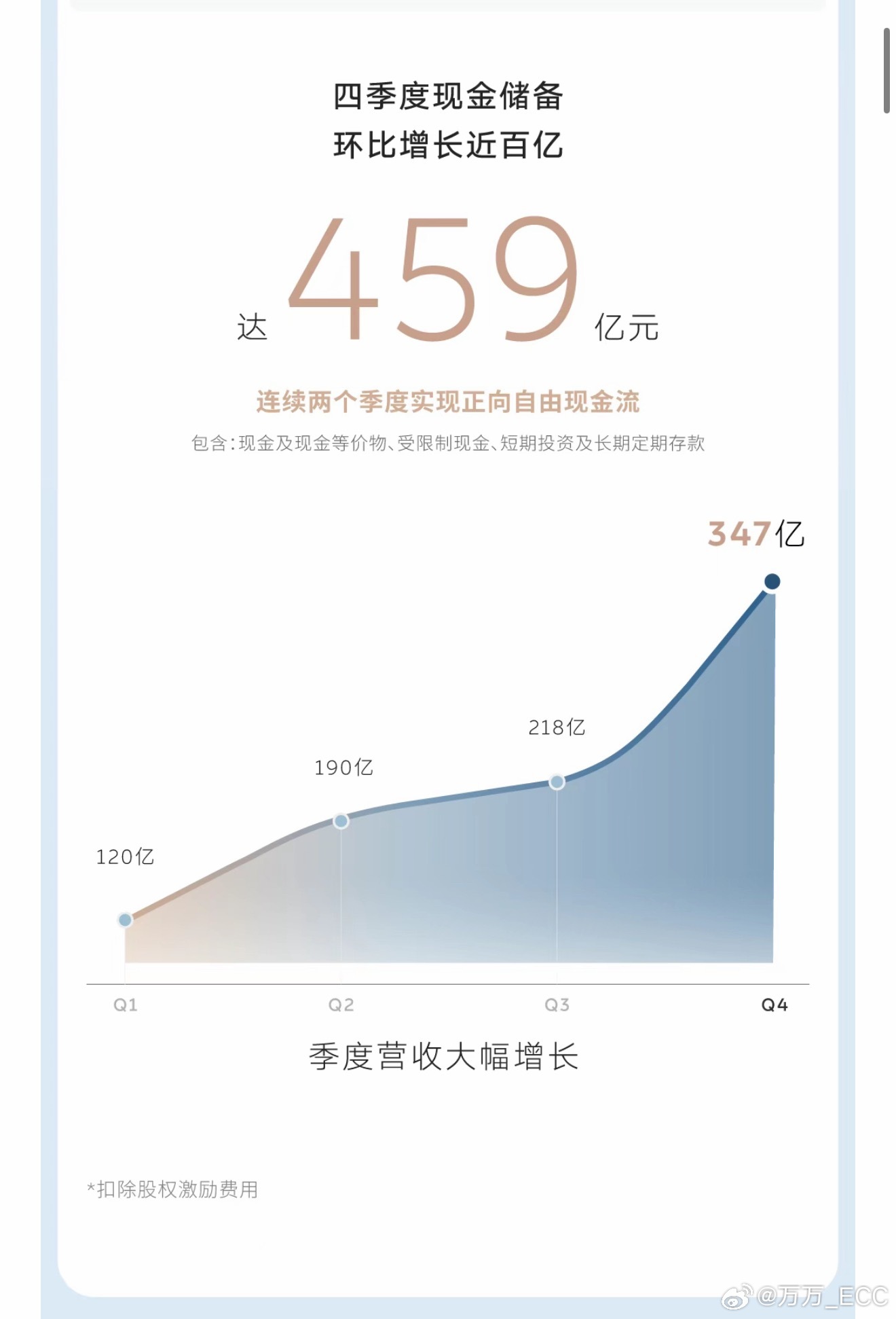 蔚来四季度盈利12.5亿元 蔚来公司四季度实现经营利润12.5亿元,全年总营收、交付量、毛利总额均创历史新高,四季度现金储备459亿元,环比大幅增长近百亿。