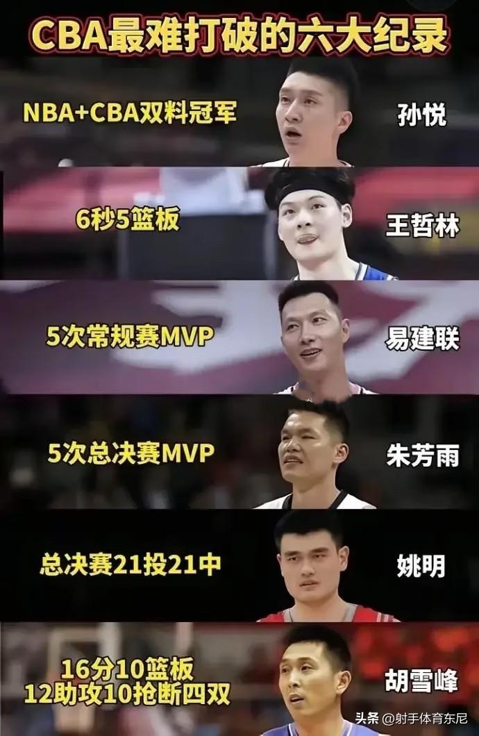 NBA的历史纪录看多了,看看CBA历史的6大纪录哪个更难破? 1、孙悦:NBA+CBA双料总冠军 2、王哲林:6秒5个前场篮板 3、易建联:5次MVP 4、朱芳雨:5次总决赛MVP 5、姚明:总决赛100%命中率21投21中 6、胡雪峰:16分+10篮板+12助攻+10抢断