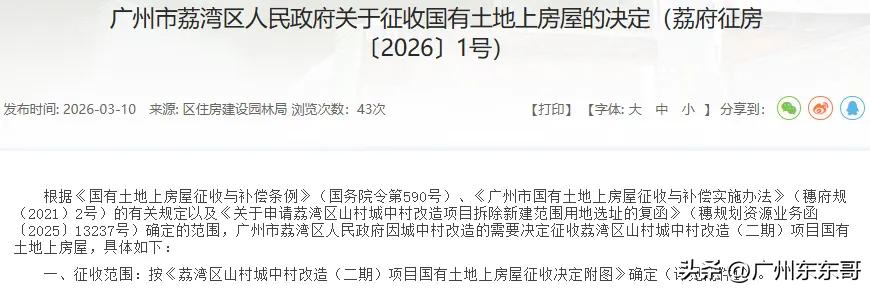 荔湾又要征地,散发出来的都是钱的味道! 荔湾山村旧改二期项目国有土地正式启动征收,涉及范围可不小,大部分都是老破小的小区和房屋,能够享受到这波拆迁红利的业主,也实在是太幸运了。 在启动征收的同时,签约也正式开始,签约期限为2026年3月10日起,至2026年5月9日,错过了可能损失不小哦。 根据荔湾以往拆迁补偿征收标准,国有土地现金补偿往往会按最高5.6万执行,在荔湾置换新房,选择余地还是很多的。 另外还有产权置换和房票安置选项,本区域内众多一手楼、二手房任君选择。 在补偿标准全市最高,方案如此多样化的情况下,荔湾旧改推进速度也是一直走在广州前列。 目前山村改造一期签约率达94%,而二期则是2026年荔湾重点计划推进的改造项目,相信也不会拖后腿的。