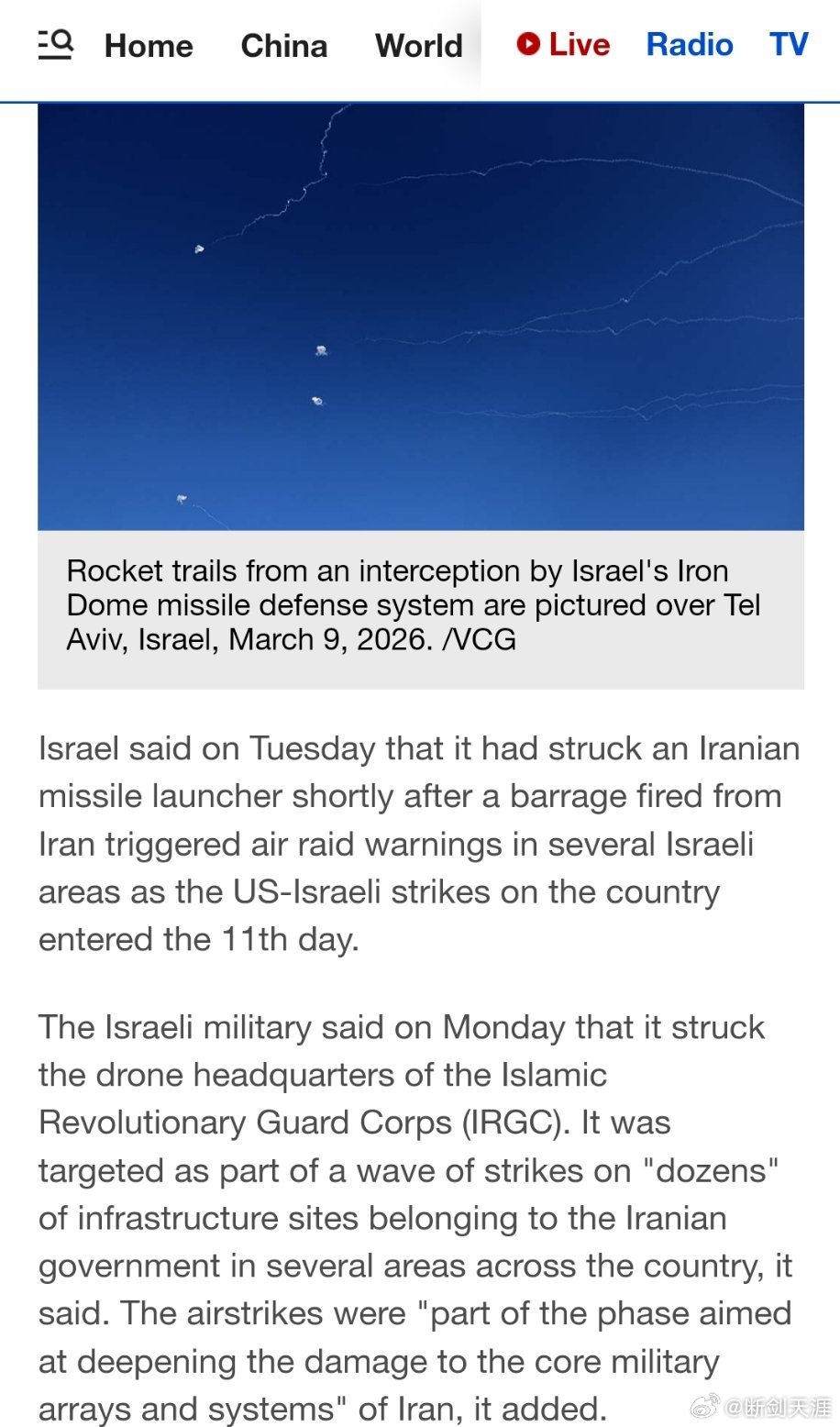 以色列军方还称,此次空袭是“旨在对伊朗核心军事阵列和系统造成更严重破坏的阶段”的一部分。(CGTN)