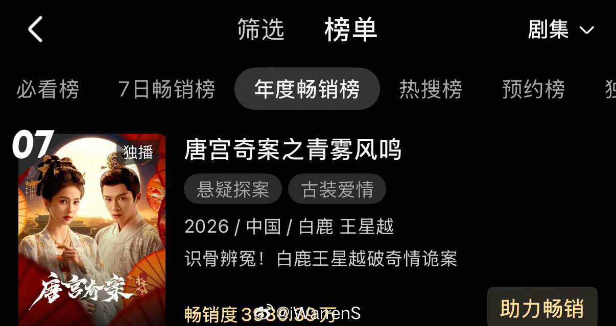 白鹿一番领衔主演唐宫奇案之青雾风鸣优酷站内拉新年榜上升到第7啦!这部剧的长尾效应太厉害了!