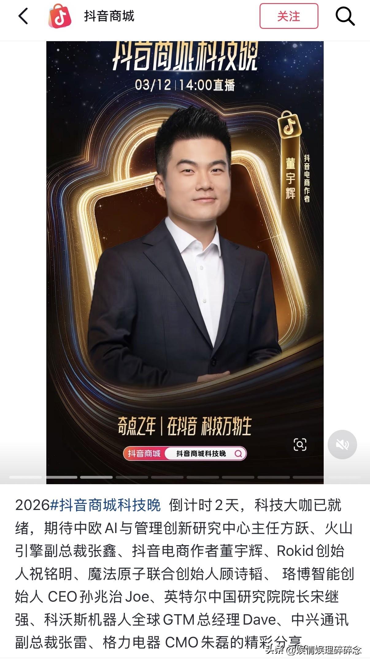抖音商城官宣, 3月12日14:00, 宇辉将以“抖音电商作者”的身份带来精彩分享。 这是AWE2026的活动,宇辉将在上海和一众科技大咖,企业高管同台分享。 宇辉一直在学习,不断在突破,将自己的影响范围扩大到了科技,文化,生活的更多维度,跨界也越走越稳。 期待各位大咖的分享,也期待宇辉用自己的方式解读科技与生活。