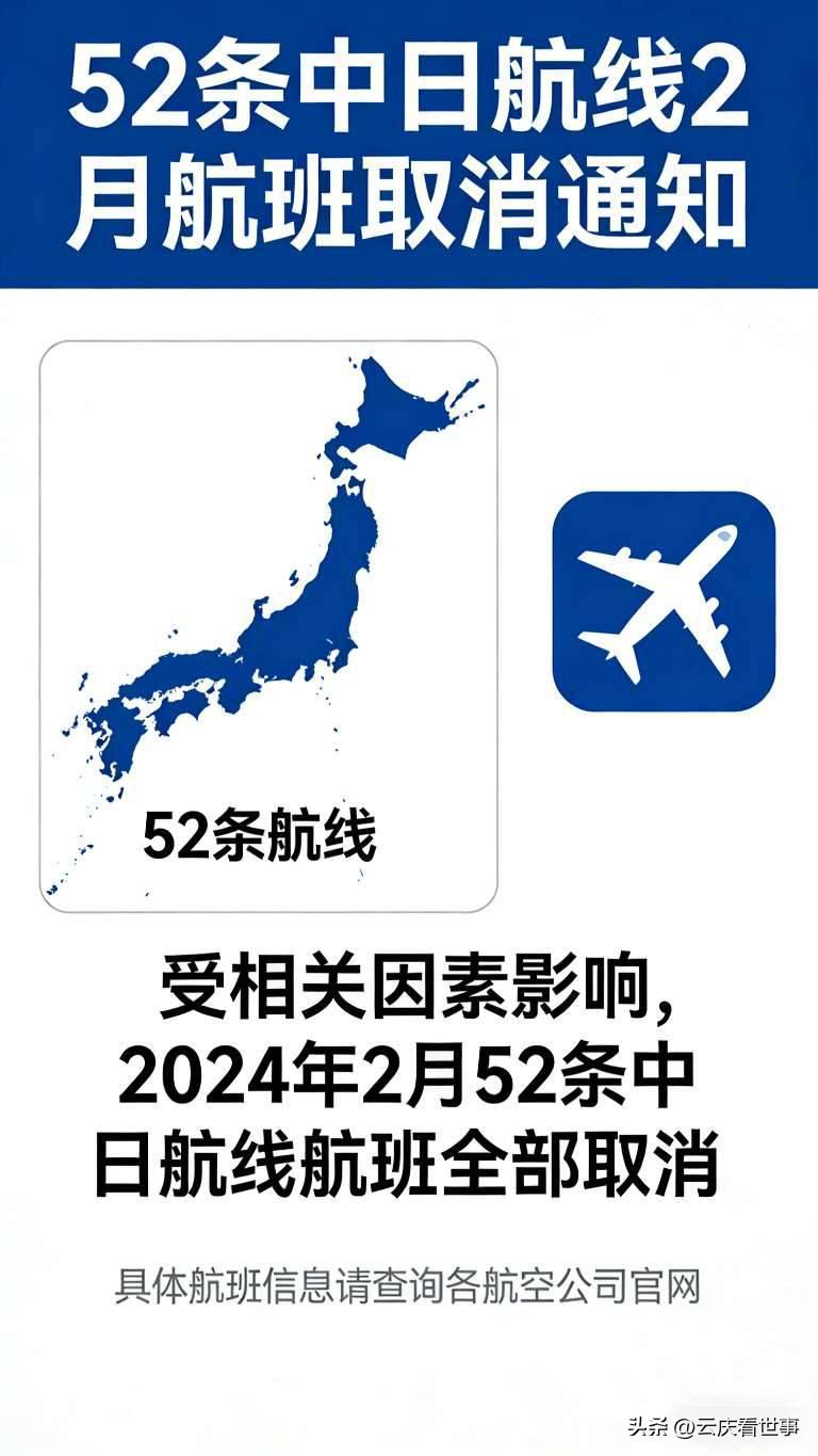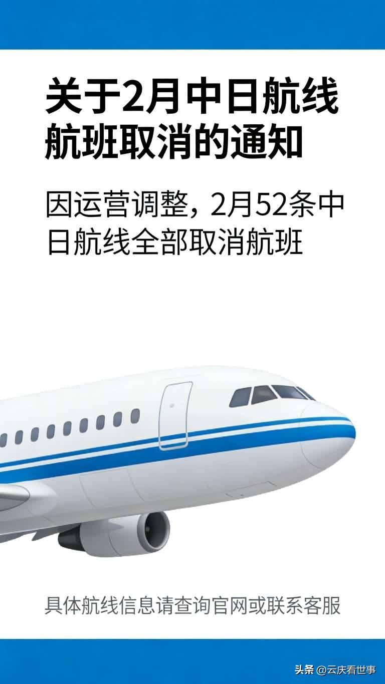 紧急提醒!2月52条中日航线全部取消航班 重要出行提醒!2月份52条中日航线取消全月航班,涉及国内多座城市与日本主要机场,大量航班暂停运行。 此次调整影响范围广,计划往返中日的旅客请及时关注航空公司通知,提前办理免费退改,合理安排行程,避免耽误出行。 民航部门将根据后续情况适时调整,一切以官方最新消息为准。 你近期有中日出行计划吗?这次调整对你有影响吗?中日航线 出行提醒