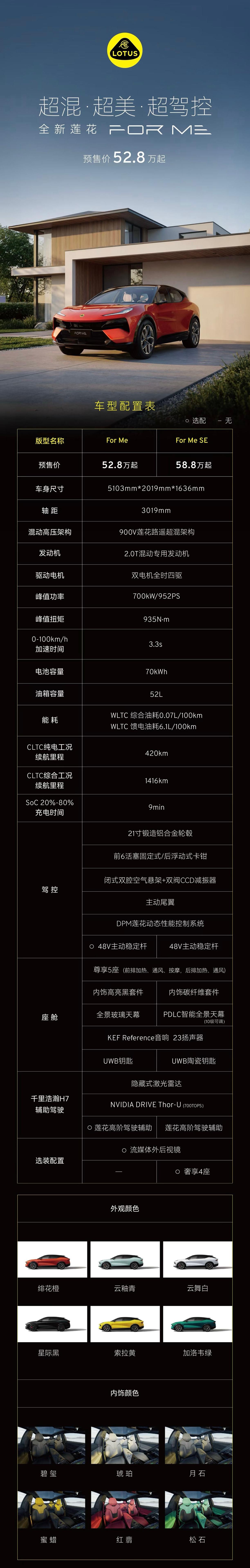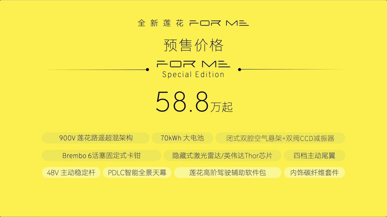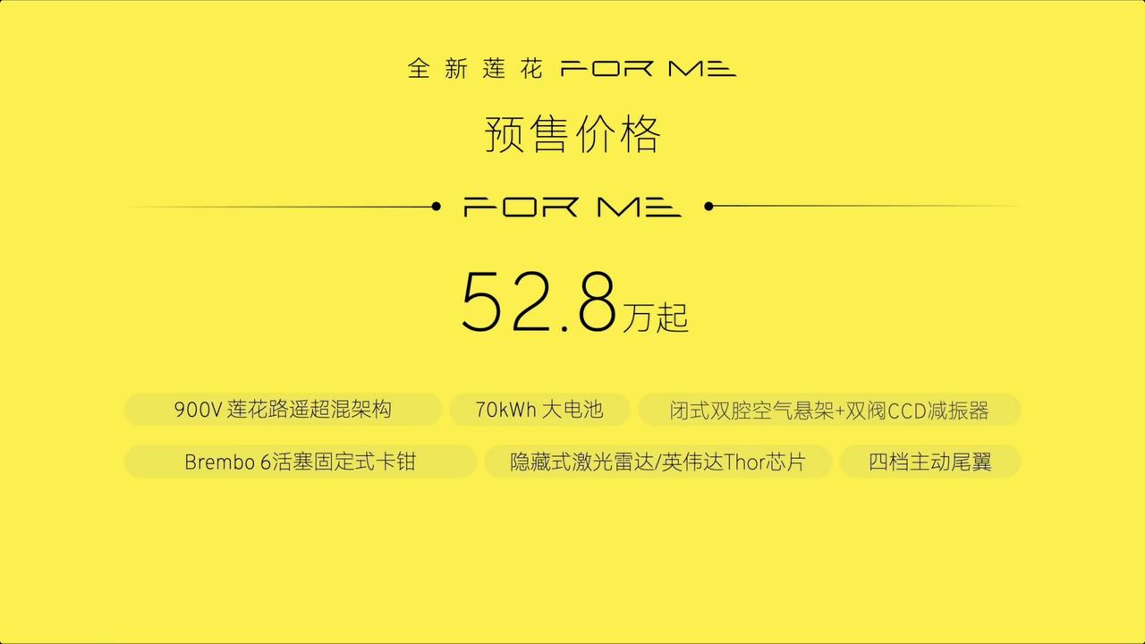 【52.8万起!莲花FOR ME正式开启预售】3月10日,莲花FOR ME正式开启预售,推出2款车型,预售价区间52.8万-58.8万元。外观上,新车基本延续纯电版车型ELETRE的设计风格,传承品牌空气动力学设计,配备4组8条Race-Aero风道、隐藏式激光雷达及主动式电动后扰流板,车身颜色新增绯花橙和云釉青两种选择。车身尺寸方面,其长宽高分别为5103mm/2019mm/1636mm,轴距为3019mm。内饰同样延续ELETRE的设计,前排配备运动型方向盘、狭长液晶仪表、大尺寸HUD抬头显示及悬浮式中控屏,下方通道区域设有物理拨杆与电子拨杆换挡。新车还配备一体式双色运动座椅,提供4座或5座布局,后排座椅靠背可电动调节,并配备后排功能控制屏;此外,还搭载10级透光调节全景天幕、23扬声器KEF音响系统及千里浩瀚H7驾驶辅助功能。动力方面,该车配备900V莲花路遥超混架构X-Hybeid,采用2.0T发动机+双电动机的组合,系统总功率达952马力,0-100km/h加速仅需3.3秒,电量剩余10%时加速仍可达3.5秒。车辆配备倍耐力P Zero 5 LTS定制轮胎和Brembo前六活塞卡钳,制动距离仅33.9米;搭载70kWh动力电池,拥有11C超高放电倍率,综合续航超1400公里。此外,新车采用全时四驱系统,底盘经过LTS“莲花工程专属调校”。【来自懂车帝车友圈】