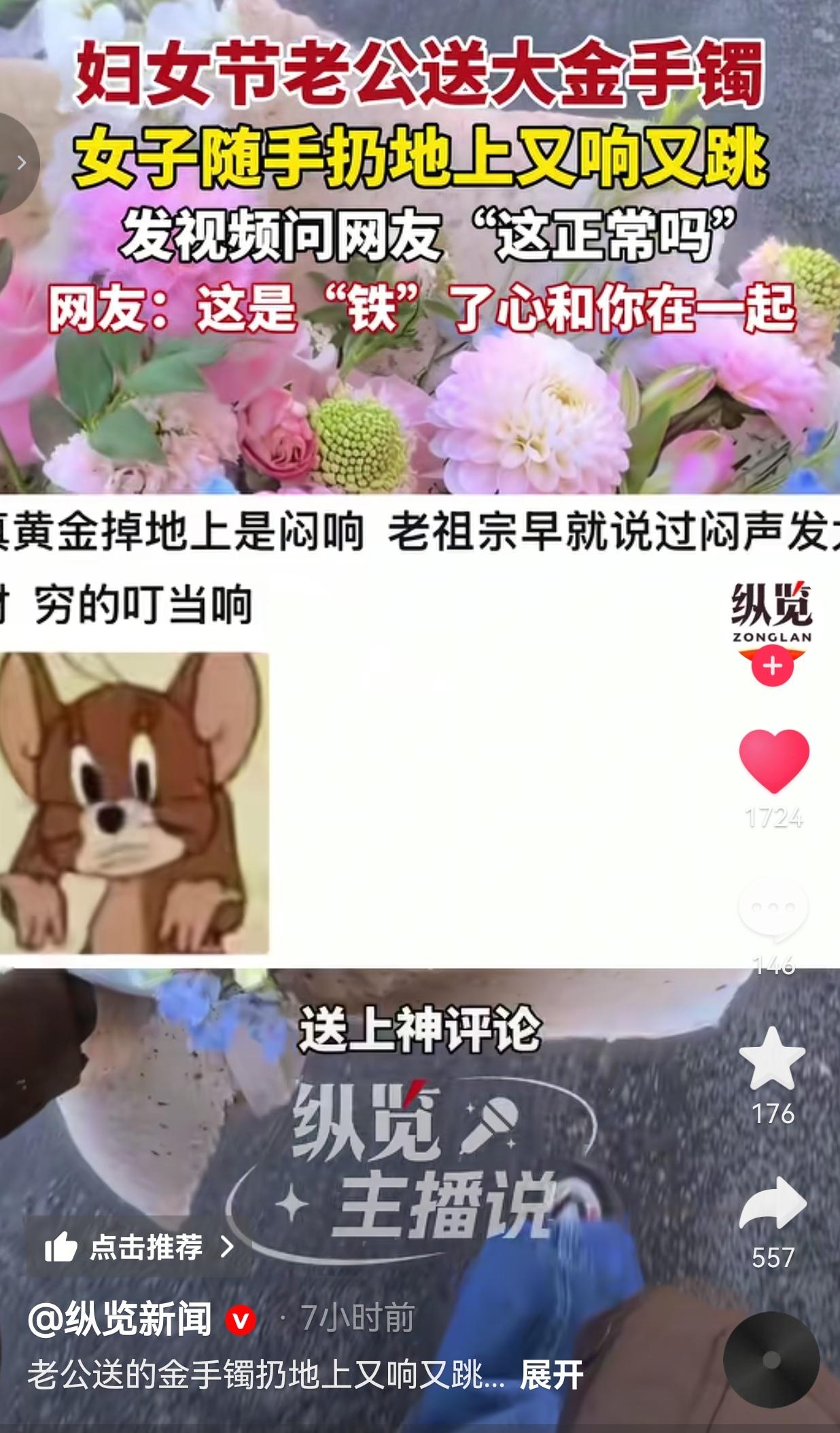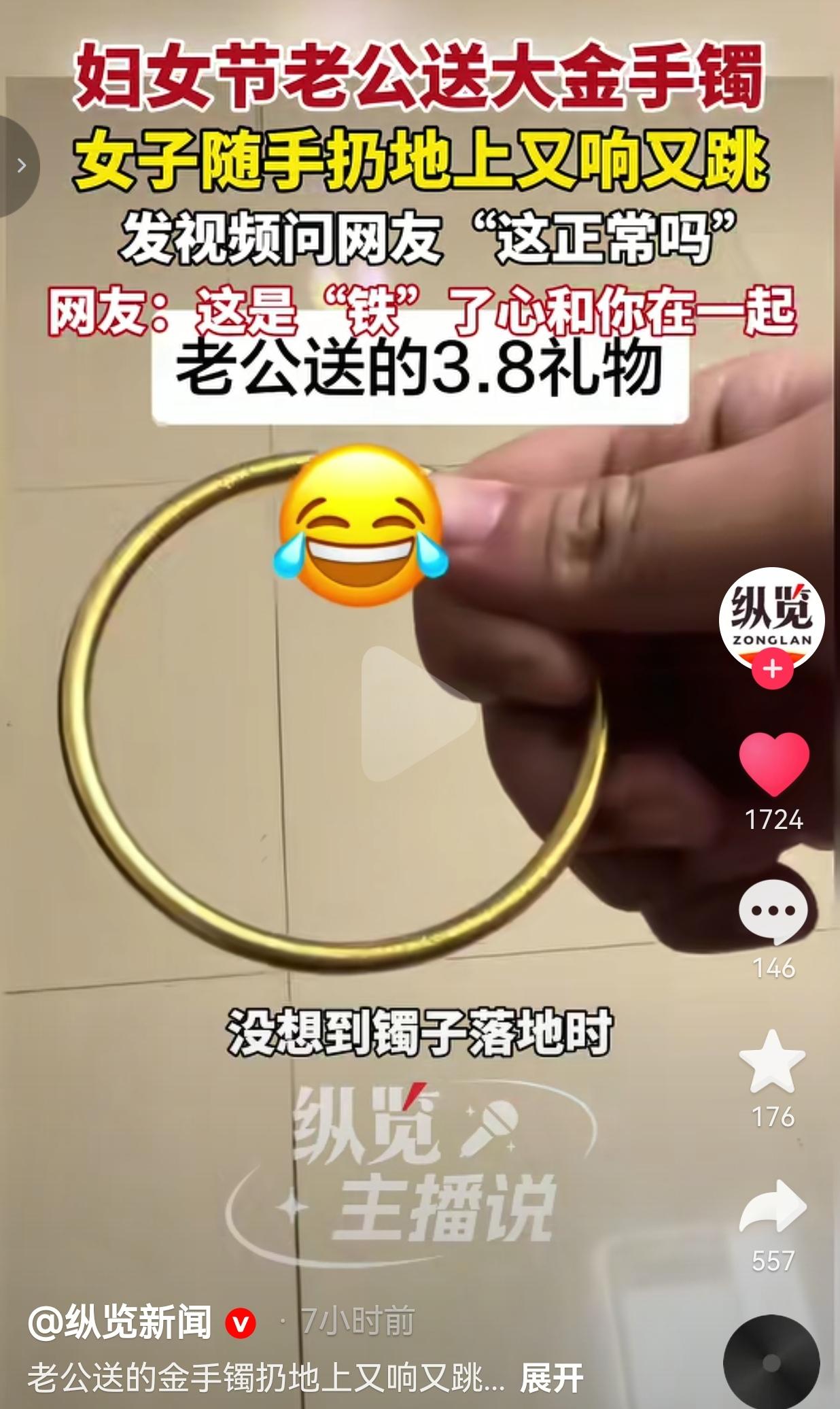 笑不活了!老公送金手镯被我扔地上“验货”,结果它跳起来了?女子怀疑真假,结果,网友的话,真的笑死人了!网友:这是“铁”了心要跟你过啊! 浙江一女子在三八妇女节的当天,收到了来自老公的礼物,老公送了一只金灿灿的大手镯,灯光底下晃得人眼睛亮,看着就值不少钱。 换做谁,第一反应肯定是开心,觉得老公心里有自己。可这位姐妹不一样,她拿着手镯越看越嘀咕:现在假货那么多,包装做得跟真的一样,我咋能确定这是真金白银,不是镀个色糊弄人的呢? 于是,她越想越不放心,她居然干了件让人直呼“大胆”的事——直接把手镯扔地上了!就听“哐当”一声,那声音脆得跟敲锣似的。 更离谱的是,这手镯跟装了弹簧似的,落地后居然“弹起来跳了好几下”,把她都看懵了! 她赶紧拍了视频发网上,一脸疑惑地问:“姐妹们,你们的金手镯扔地上也这么响、还会跳吗?这正常不?” 视频一发,评论区直接炸锅了!网友一副看热闹不嫌事大的样子,竟然说:“金不响银不跳,老铁又响又跳,姐妹这是‘铁’了心和你在一起啊!” 也有的网友说:“别验了,这是实心的爱意,摔不碎、跳得高!” 还有的网友调侃:“老公:我送的是金,你验的是情,这一跳,跳出了夫妻情深!” 其实懂行的人都知道,这事儿根本不是啥“假货实锤”。现在很多金手镯是空心的,黄金本身有弹性,掉地上发出清脆声响、反弹跳动太正常了,反而要是闷声不响的,才真得担心是不是假的。 但我看完这事儿,心里却不是只有好笑。我忍不住琢磨:咱们为啥会忍不住去“验货”? 说到底,还是因为太在意这份礼物背后的心意,也太在意这段感情了。结婚过日子久了,柴米油盐磨掉了不少浪漫,咱们总怕付出的真心被辜负,怕老公的敷衍,所以一点点风吹草动,就忍不住想较真、想验证。 可咱们回头想想,老公愿意花心思准备金手镯,哪怕是选礼物时没考虑到空心的特性,这份心意难道不珍贵吗?他或许不懂怎么精准挑款式,或许没想着要多贵重,但他记得妇女节,愿意为你花钱、花时间,这就比嘴上说的“我爱你”实在多了。 所以说,咱们过日子,真的不用太较真。礼物的真假不重要,重要的是送礼物的人心里有你。日子的完美不重要,重要的是两个人一起把日子过暖。 大家觉得呢?欢迎大家评论区讨论留言。