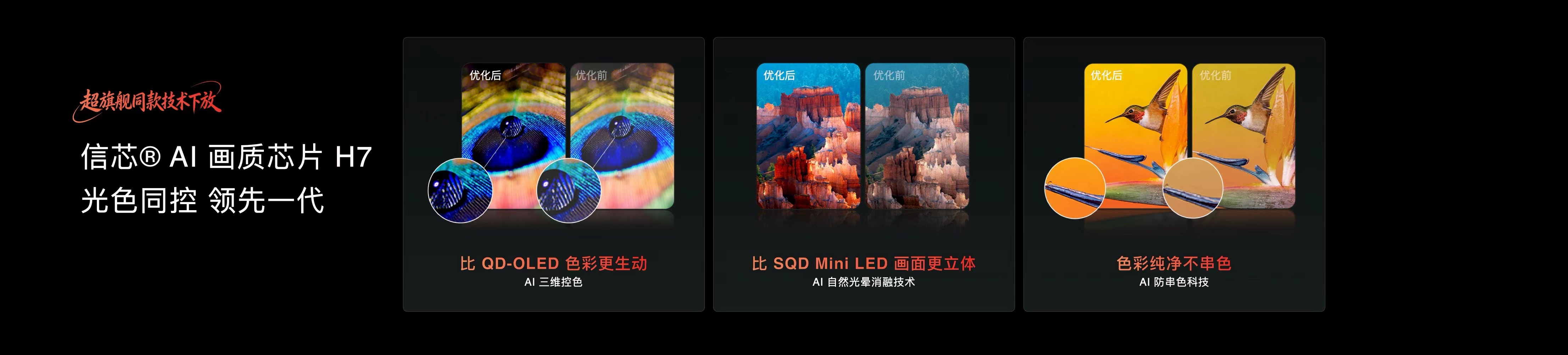 搭载玲珑真彩背光+信芯H7芯片双引擎,自研车规级RGB发光芯片实现三原色独立直出,无需量子点中转,达成100% BT.2020色域、△E<0.7超高色准,相比QD-OLED色彩更生动,对比SQD-Mini LED画面更通透立体。配合信芯H7“5090级独显”算力,实现7560个控色分区+5100nits峰值亮度,像素级光色同控让光晕降低60%,彻底解决串色、泛白痛点;AI细节重构与景深模拟技术,让低清内容秒变4K,画面纵深更自然。