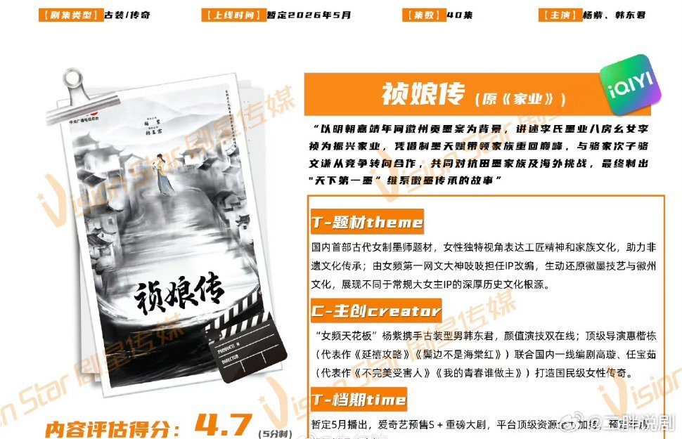 【题材】国内首部古代女制墨师题材,女性独特视角表达工匠精神和家族文化,助力非遗文化传承;由女频第一网文大神吱吱担任IP改编,生动还原徽墨技艺与徽州文化,展现不同于常规大女主Ip的深厚历史文化根源。【主创】“女频天花板”杨紫携手古装型男韩东君,颜值演技双在线;顶级导演惠楷栋(代表作《延禧攻略》《鬓边不是海棠红》)联合国内一线编剧高璇、任宝茹(代表作《不完美受害人》《我的青春谁做主》)打造国民级女性传奇。【档期】暂定5月播出,爱奇艺预售S+重磅大剧,平台顶级资源全力加持,预定年度国民级爆款席位。祯娘传招商