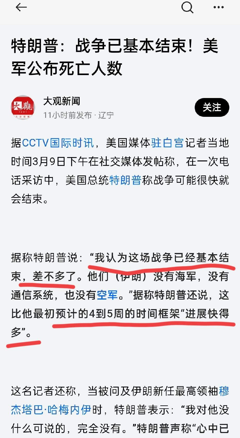 战争已基本结束 特朗普称伊朗没有战斗能力了 美国公布死亡人数 只有8个 后山可能还会有更多