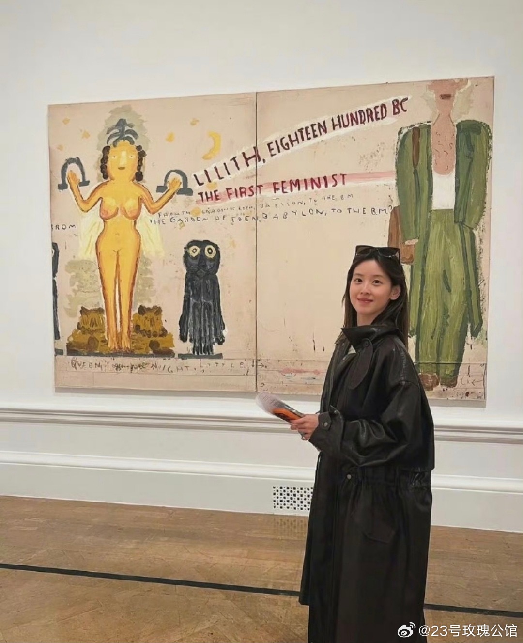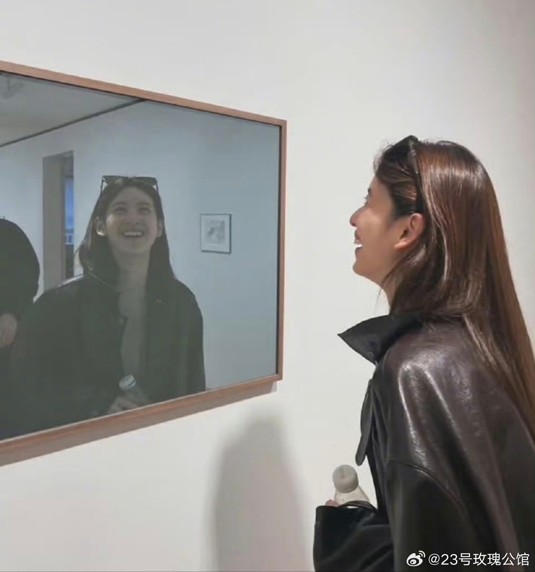 章泽天晒逛展照片,素颜对镜大笑,状态很松弛。