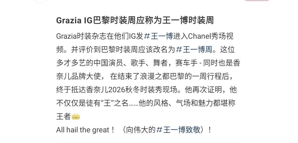 外媒Grazi评价巴黎时装周应改名“王一博周”。还是外媒敢于评价[赞]。都用上了“向王一博致敬”这样内娱前所未有的赞美,说明王一博早就超越了普通明星的范畴,他展现出来的各种专业实力令人佩服,更重要的是他的精神内核与人格魅力赢得了世界的尊敬。(骄傲[小鼓掌]) 在没有内娱黑水、营销运作和资本干扰的巴黎时装周上,外媒的镜头与报道真实反映了王一博的影响力。他一出现,外媒就说Chinese superstar来了。镜头闪不停,东方巨星闪耀巴黎!