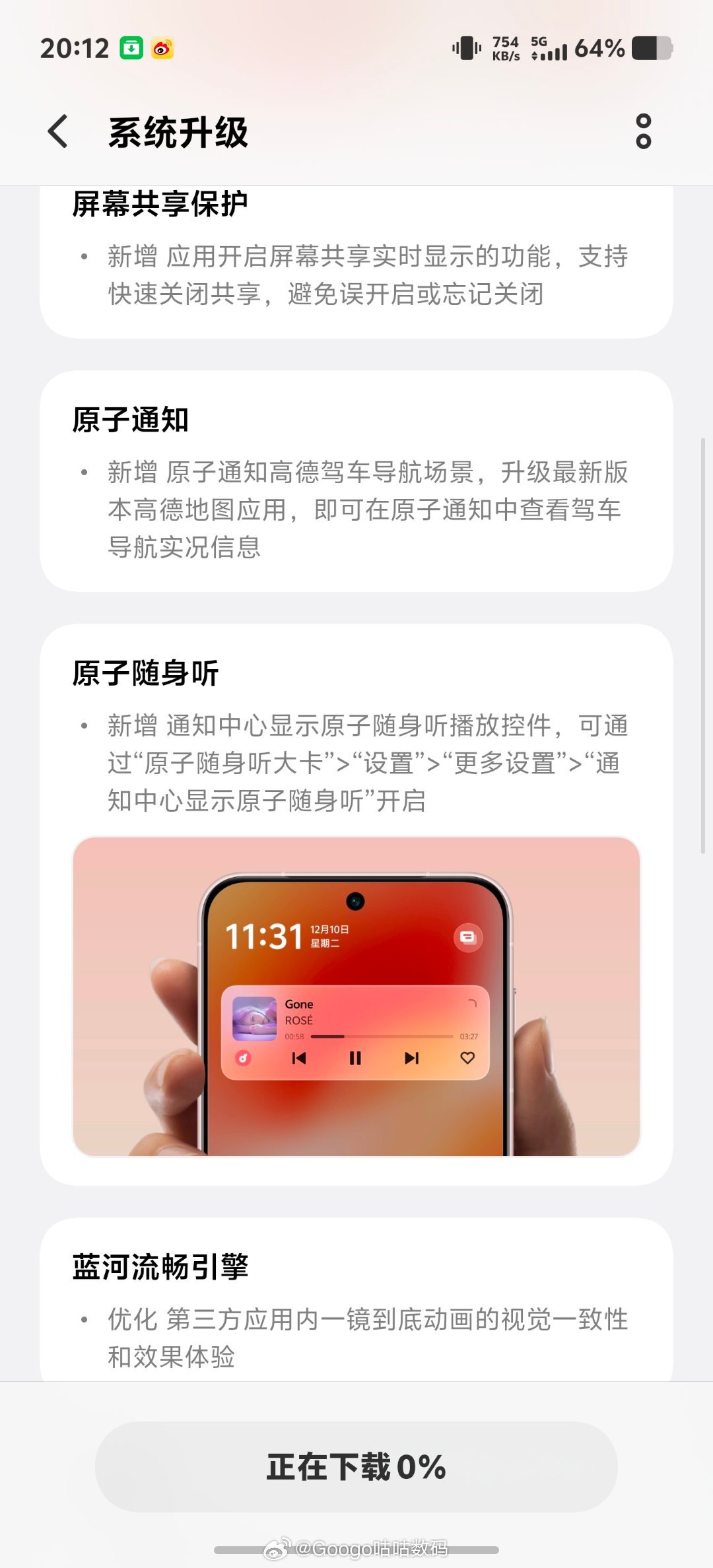 iQOO15 ultra更新内容总结通知与状态栏新增悬浮通知临时屏蔽功能;屏幕共享保护支持应用共享实时显示与快速关闭;原子通知新增高德驾车导航场景,原子随身听可在通知中心显示播放控件;蓝河流畅引擎优化了第三方应用动画效果;无障碍通话语音转文字、小V帮读播报、小V电话助手界面、vivo互传与iPhone的局域网直连等均得到优化,同时提升了系统整体稳定性。这次又改进了很多细节大家快点更新吧。iqooiqoo15 ultra