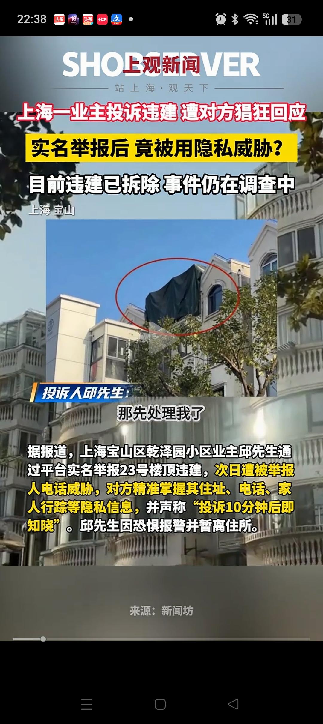 上海,男子发现小区一栋楼的楼顶盖了块黑布,怀疑存在违建,便进行了举报。没想到,第二天就接到了被举报人的电话。她不仅能清楚的说出他是小区的业主,住哪里,还能一字不差的读出举报工单上的全部内容。 当地城管的意思是,他们只有举报人的姓氏和电话号码,其它内容一概不知。也核实了举报内容,最终顶楼的业主选择了自行拆除。 而小区的物业经理表示:被举报的业主曾经是小区的志愿者,还做了挺久的,后面做生意去了。具体情况他们也不清楚 其实这个事也简单,只需要把顶楼的女业主请过来,好好沟通下。并把她的通话记录给公开,就知道是谁给她打的电话。 作为举报人的邱先生,也可以放心回家。这件事本身并不大,已经过去了,没必要放心上。 但是社区和物业一定要引以为鉴,收到举报工单后,切不可泄露举报人的信息。应该自己去和被举报人沟通,找到理想的解决方案。