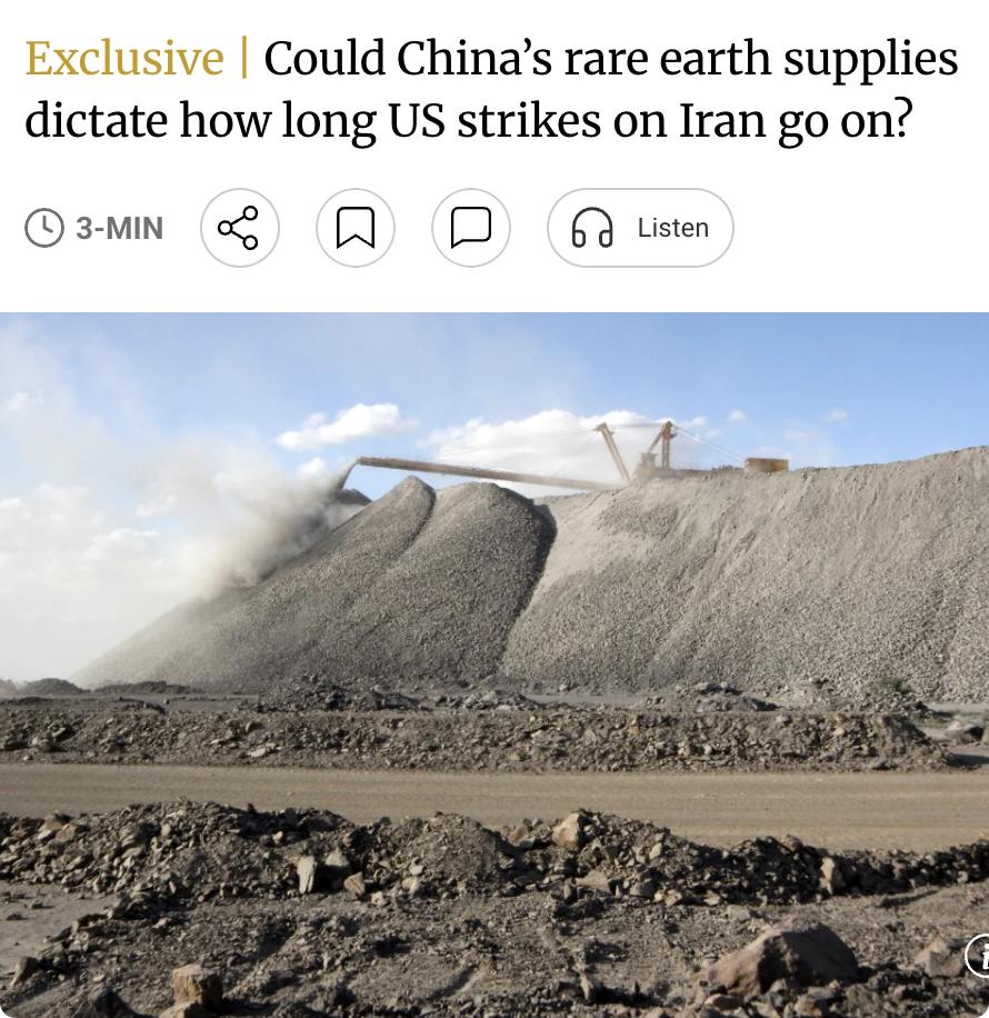 外媒:美国打击伊朗的军事行动可能让中国获得新的稀土筹码。 消息人士称,美军先进武器系统高度依赖中国稀土,而华盛顿库存仅够维持约两个月。 特朗普上周还表示将以"凶猛、坚定的决心"对伊朗持续打击四至五周,但周一突然称目标几近达成、危机或"很快"结束。 分析指出,美国对中国稀土的依赖使其在冲突持续时间和成本上受制于中方,赋予北京"重大间接影响力"。