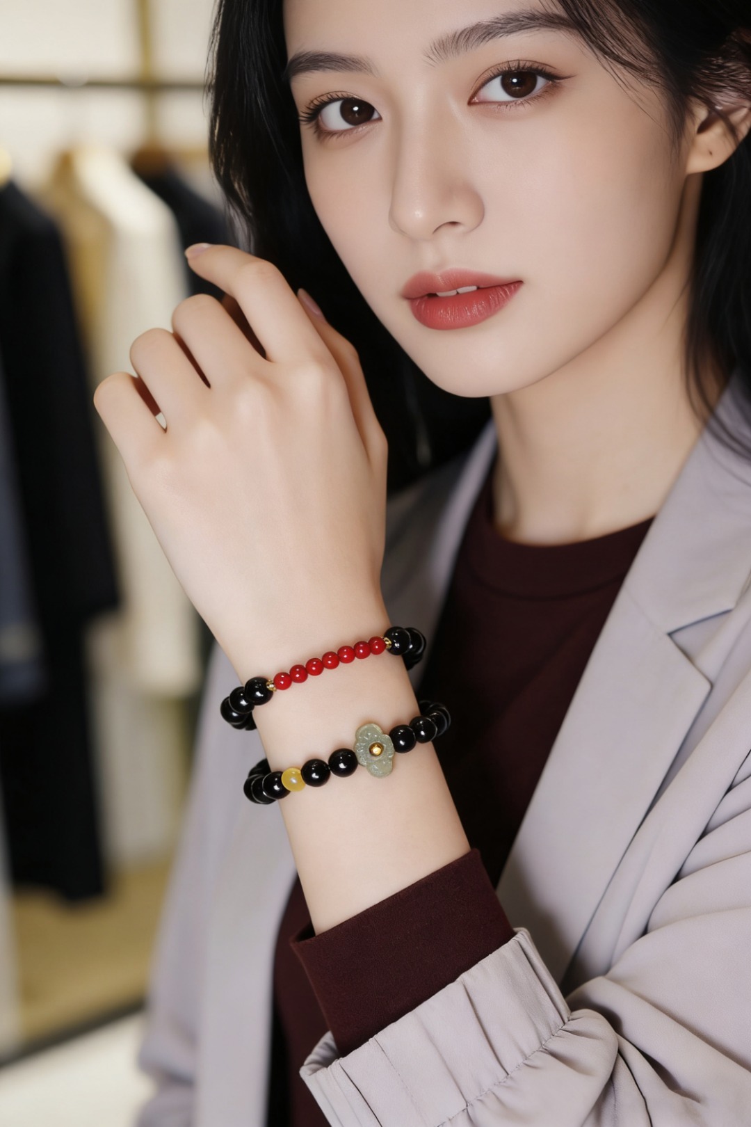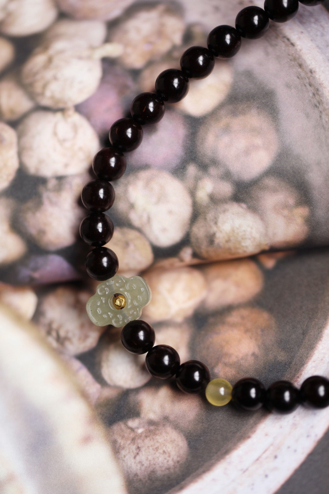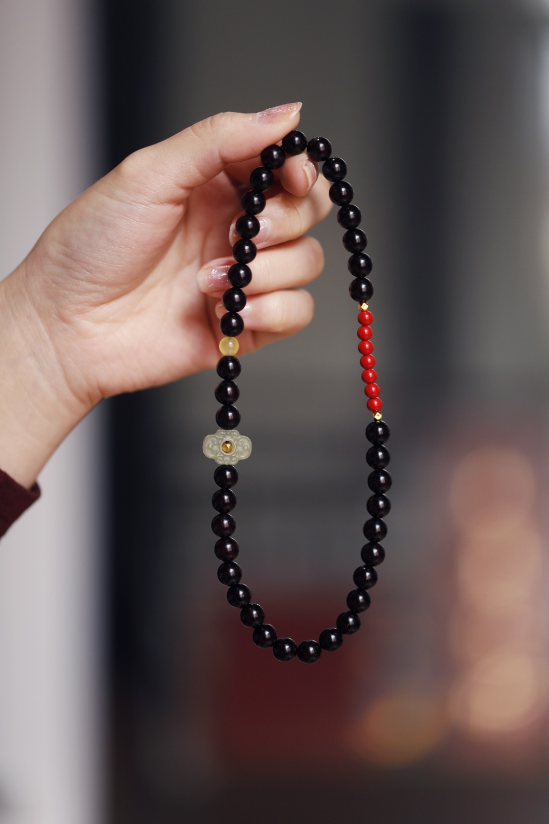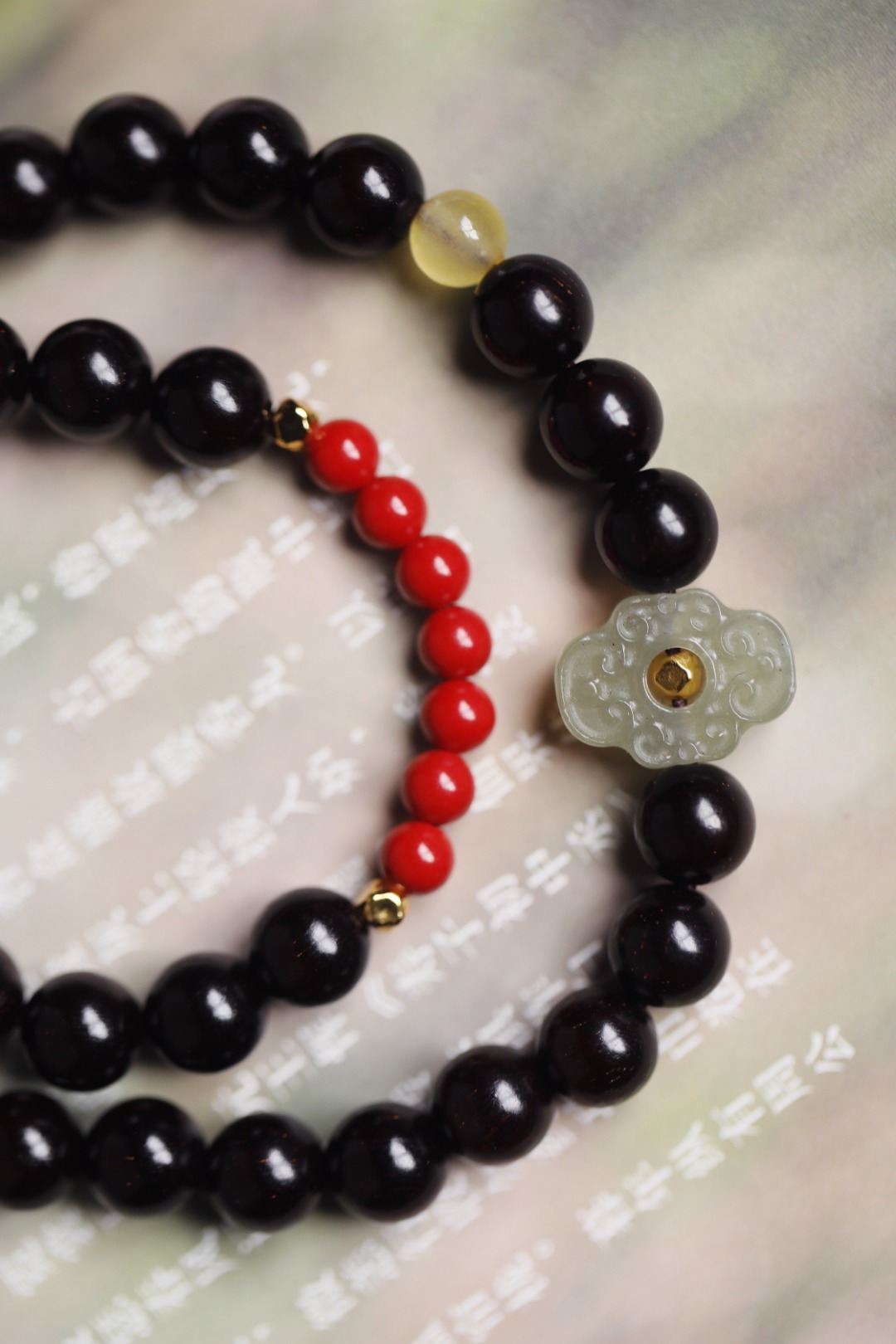 质坚润泽的小叶紫檀,油性充足,原创设计清雅,搭配玉石点缀,腕间环绕,清雅矜贵尽显。配件:朱砂、和田玉、925镀金、玉髓 紫檀 原创【承禧】8mm 39颗 手串