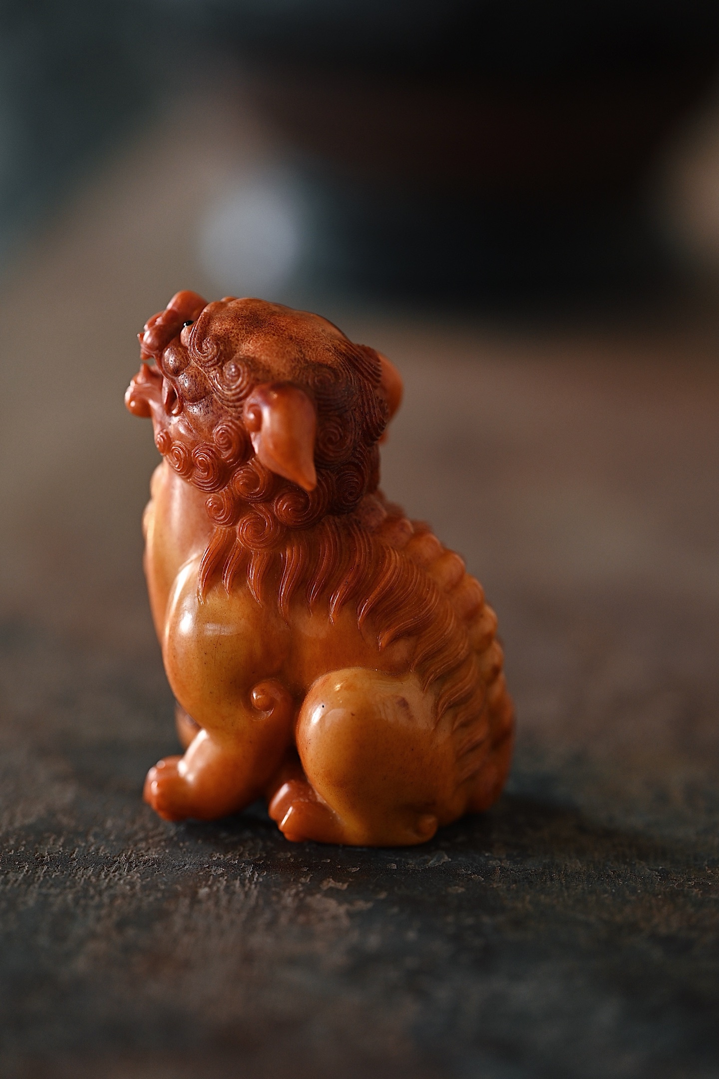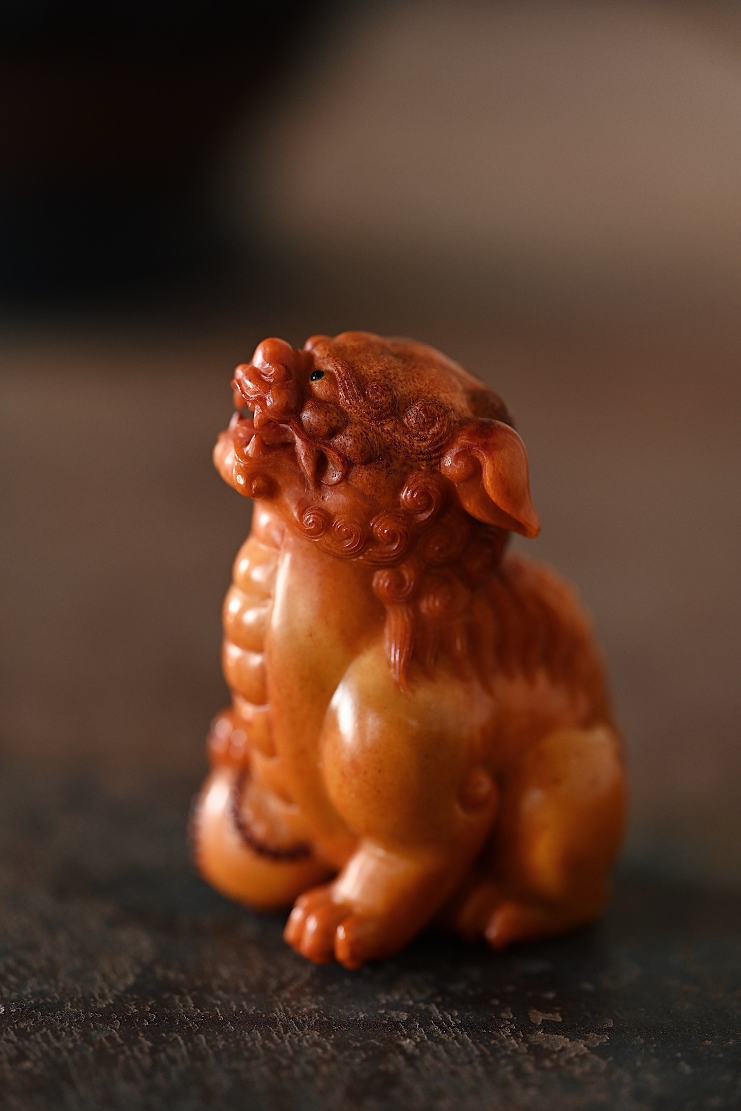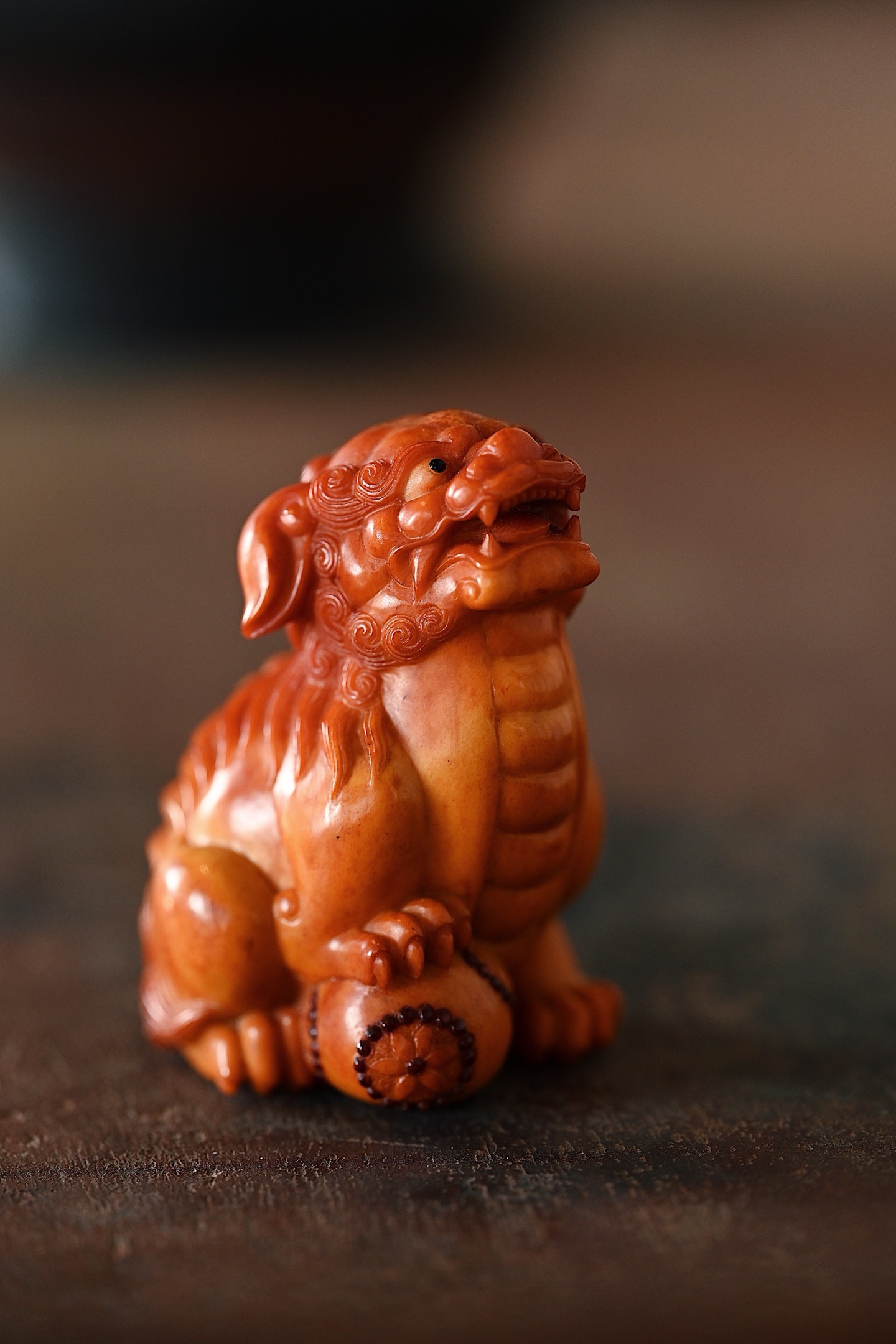造型简洁流畅,线条大气,雕刻瑞狮蹲坐,神态灵动,足下绣球细节十足,陈设、把玩可见精致。