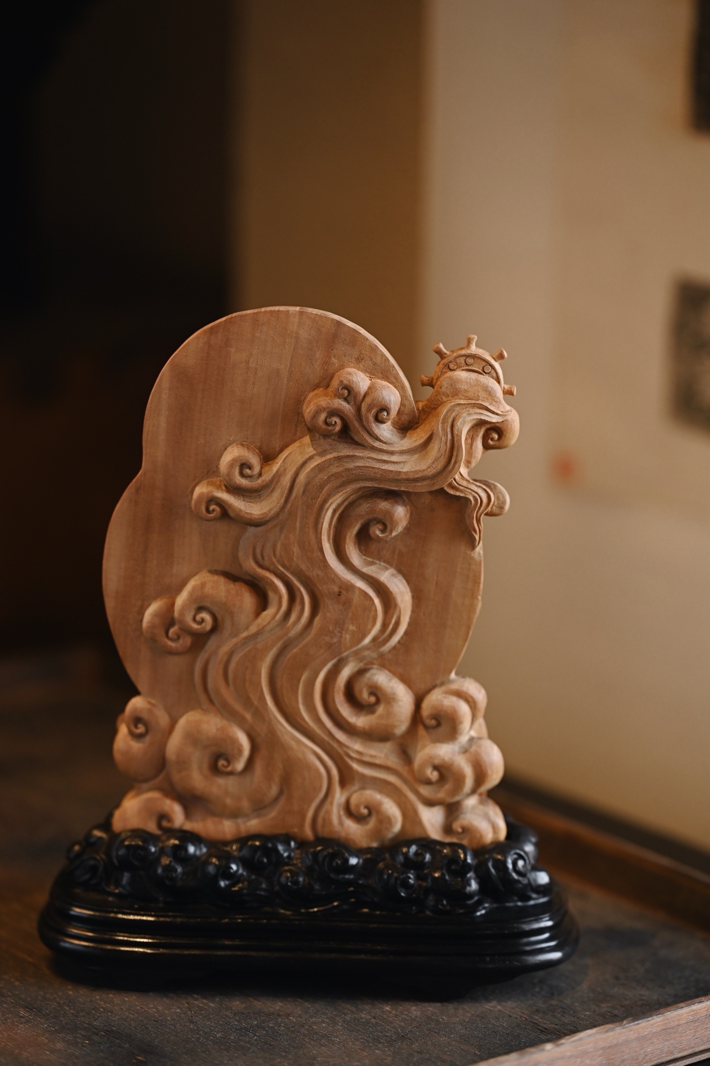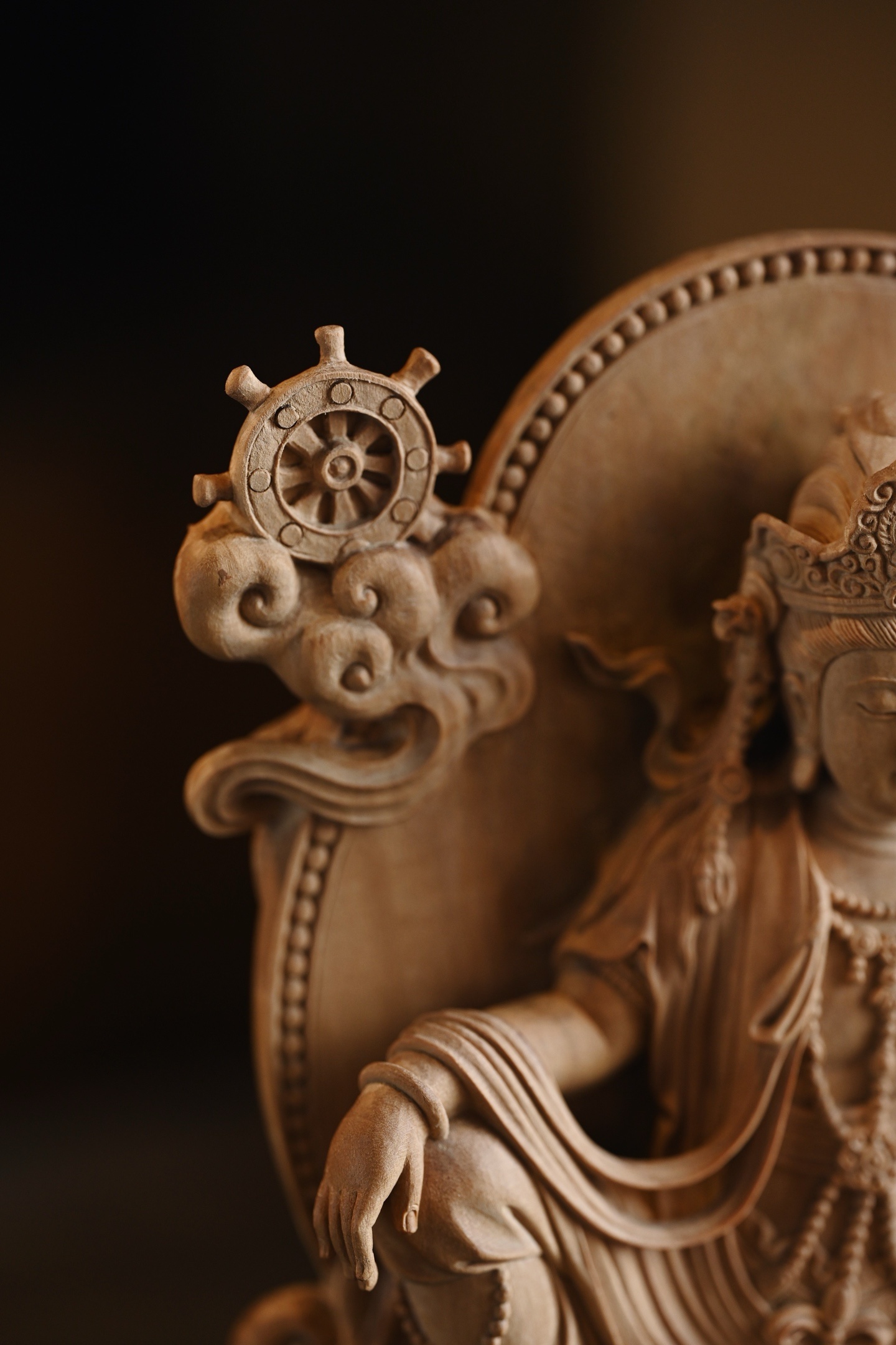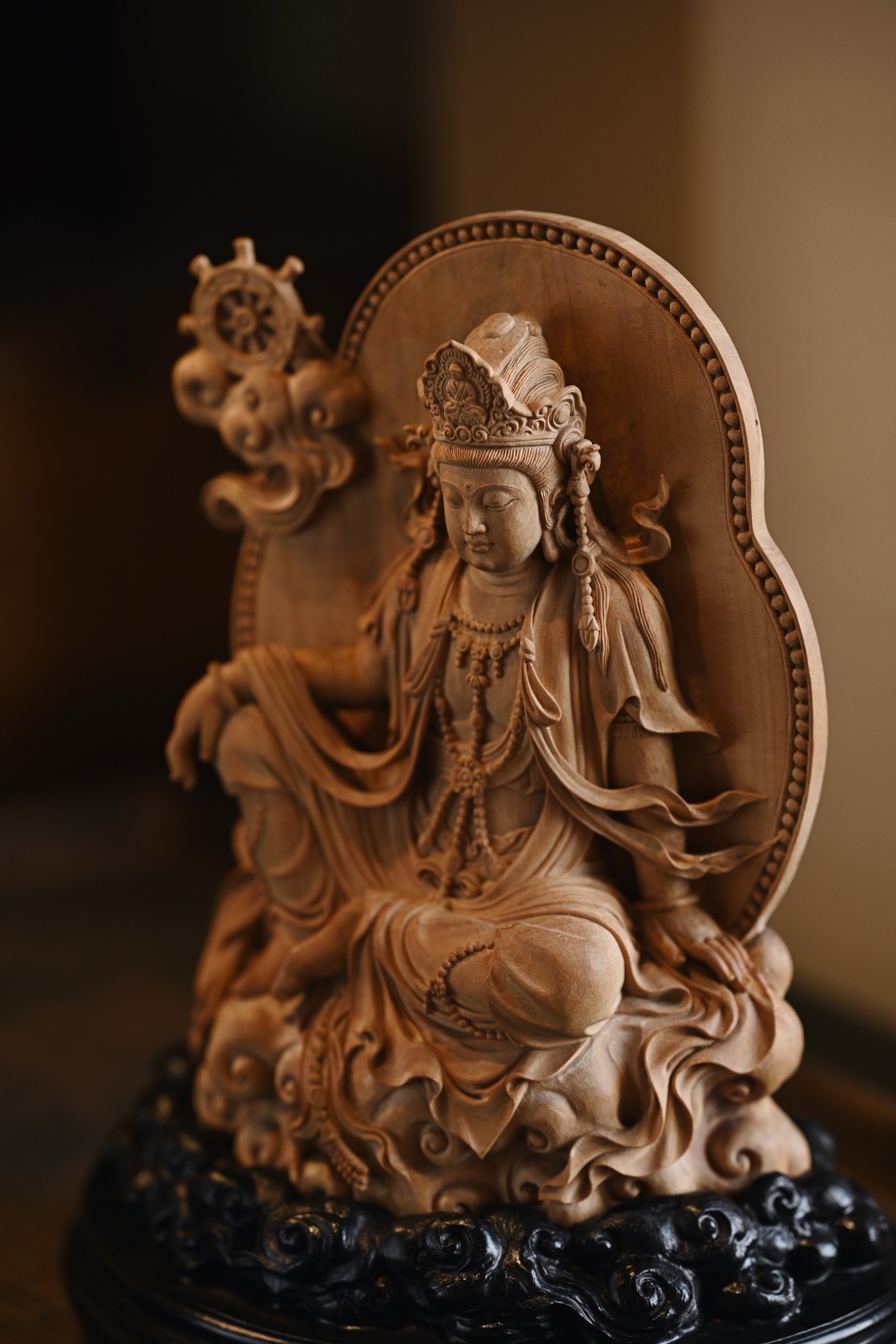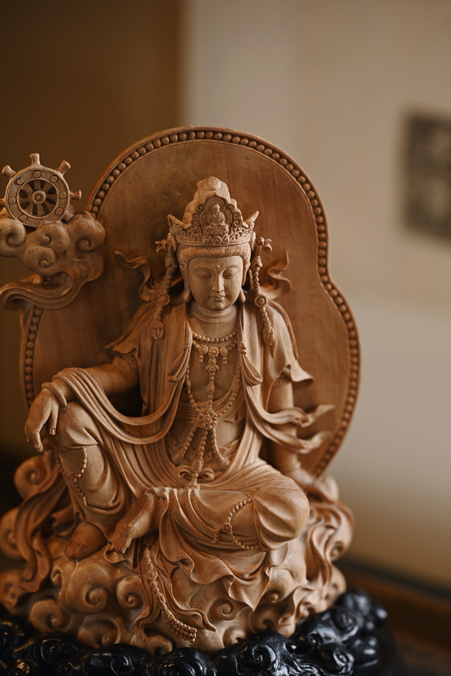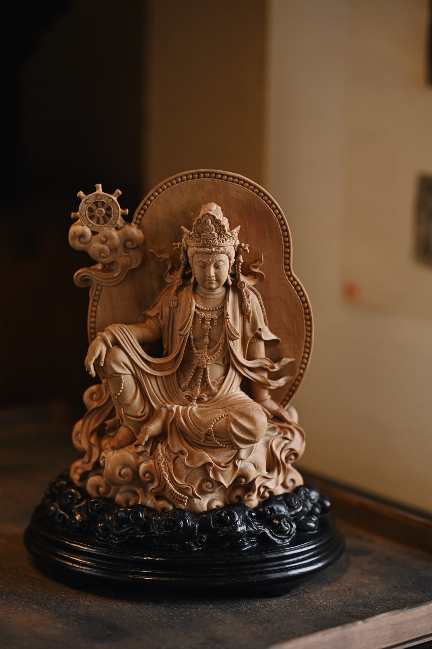 整料雕刻,雕工细腻,观音自在而坐,发髻高耸,脸庞丰润,着天衣绸裙,衣褶线条疏密有致,座下祥云升腾,古韵弥深。