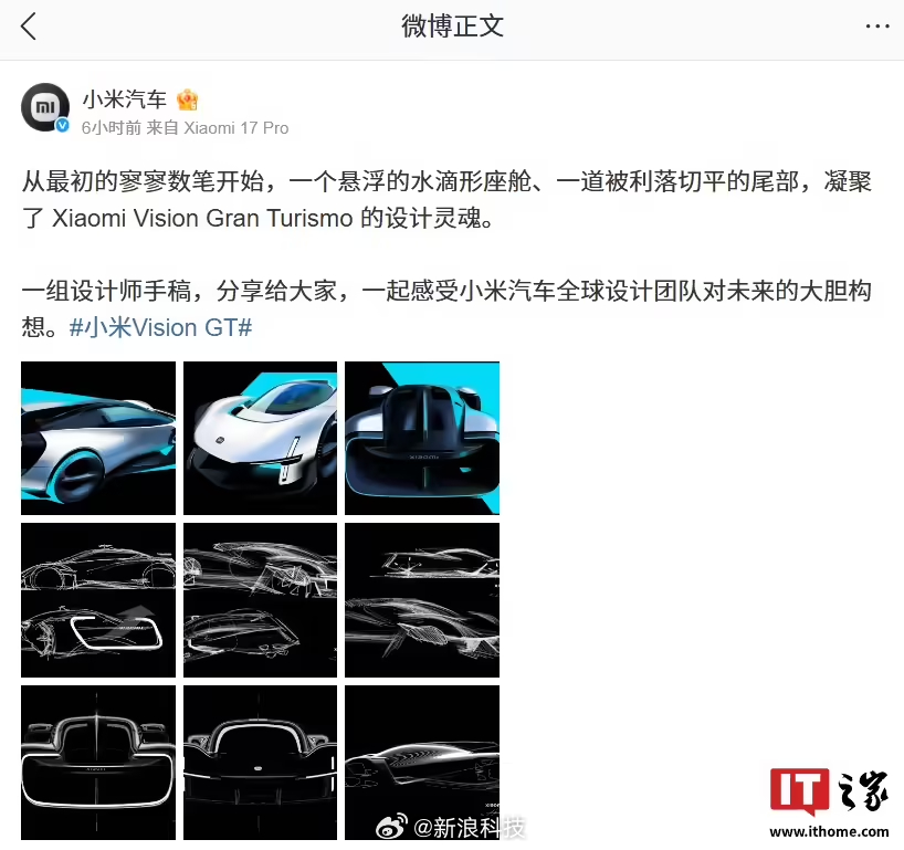 官方称:“从最初的寥寥数笔开始,一个悬浮的水滴形座舱、一道被利落切平的尾部,凝聚了 Xiaomi Vision Gran Turismo 的设计灵魂。”