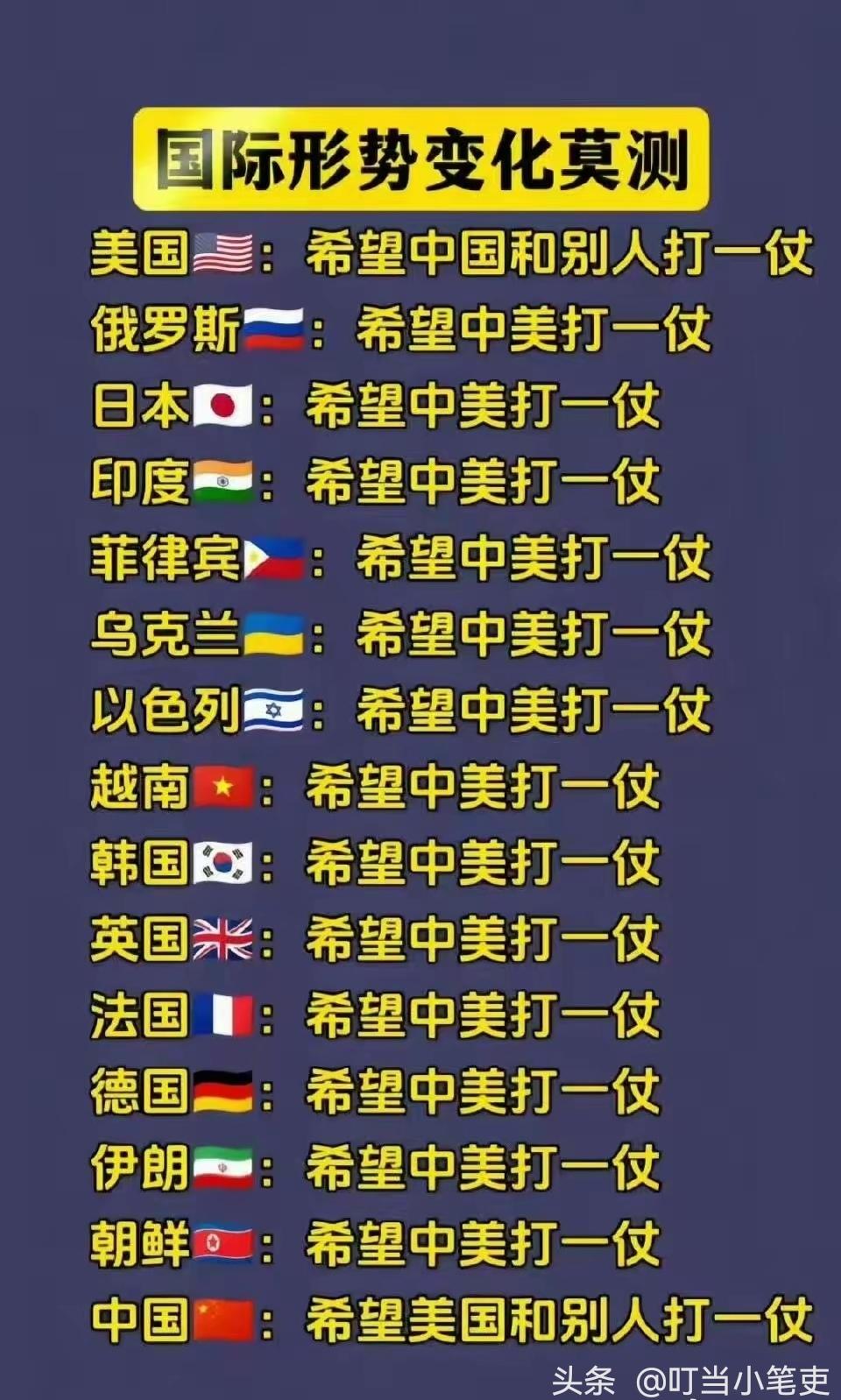 关于这些国家的内心想法,是事实吗? 大部分应该不是事实。 去猜一些国家的内心想法,本身就是一件异想天开的事,一方面是这些想法大多既没有成立的理由,也不符合存在的逻辑;另一方面就是试图安排这些国家是以旁观者的身份,抱着“看热闹不嫌事大”的心态,而不是科学严谨的态度。 如果这些国家都希望世界前二经济体之间,真枪实弹地干上一架,先别说他们会从中得到什么好处,单是世界安全局势会因此而变得危机四伏,就已足够让他们吃不了兜着走了。 假如他们还妄想从中混水摸鱼,那纯粹是想多了。