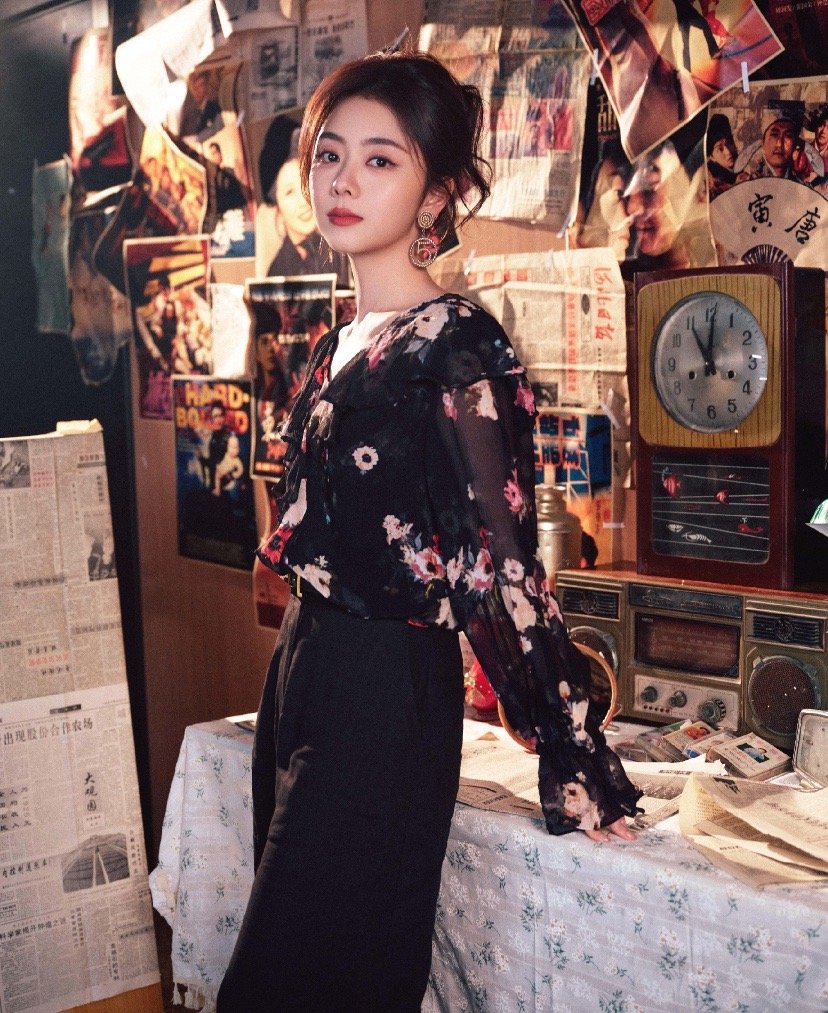 谭松韵 这套复古港风造型真的太戳我了🥹黑底碎花雪纺衫配高腰黑裤,慵懒半扎发+金属圆环耳坠,往满是旧报纸和老物件的房间里一站,氛围感直接拉满!温柔又带着点故事感,谁看了不心动~