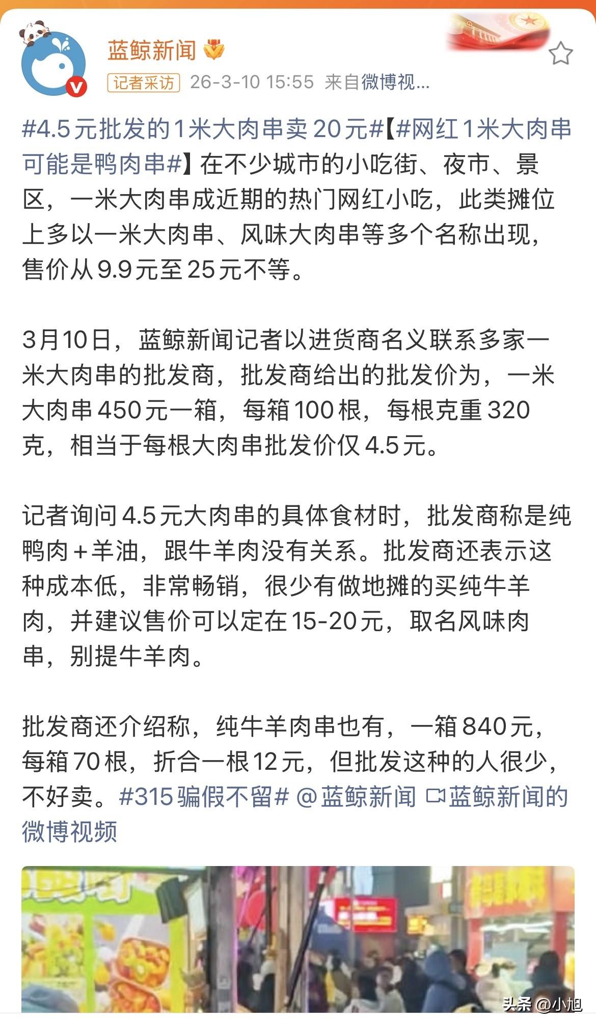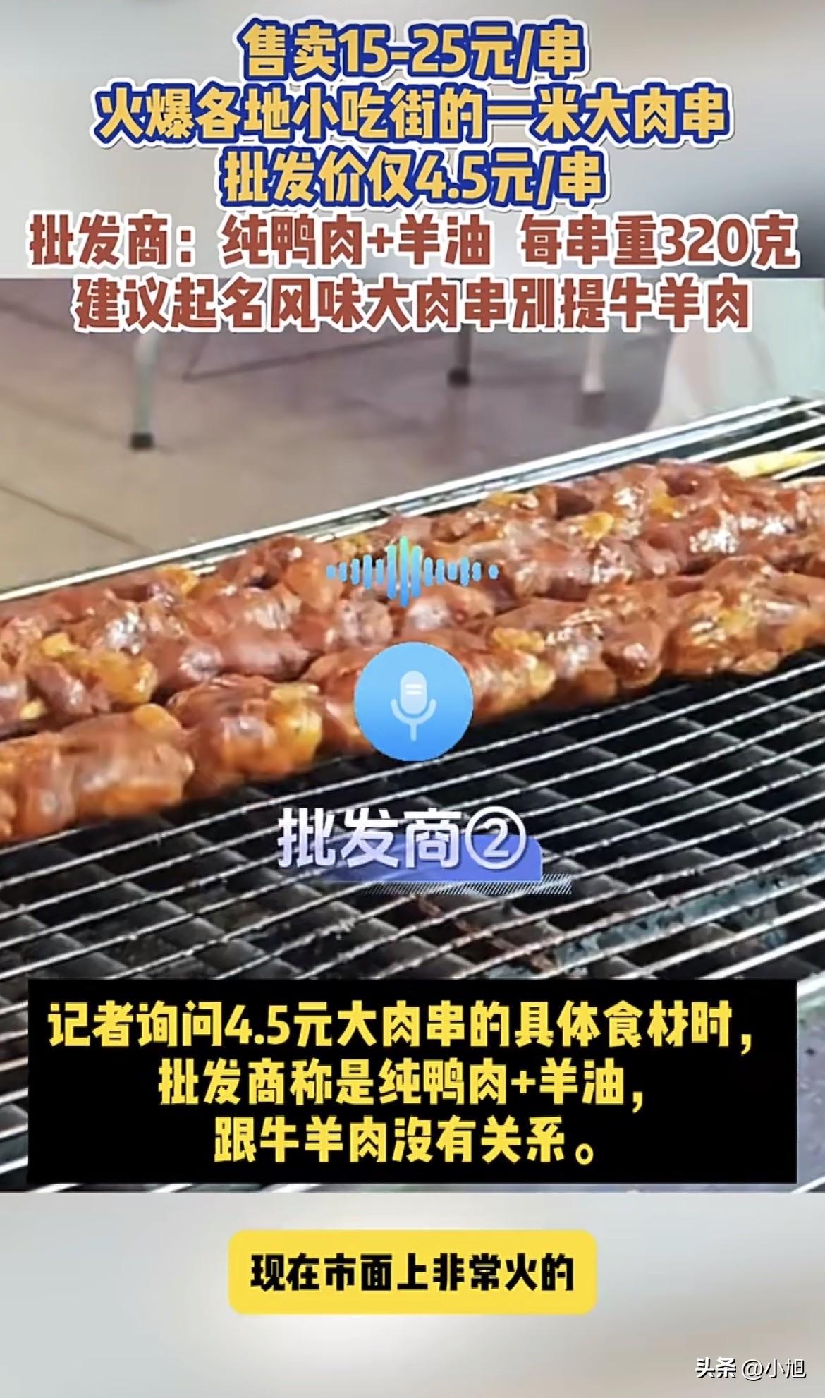 四块五一根的一米大肉串,批发商说得明明白白:纯鸭肉加羊油,跟牛羊肉没半毛钱关系。关键人家还补了一句——很少有做地摊的买纯牛羊肉,那玩意儿不好卖。 什么叫“不好卖”?不是消费者不爱吃牛羊肉,是卖真货的拼不过卖假货的。十二块一根的真羊肉,跟四块五的鸭肉串摆在一起,外表看着差不多,价格差三倍,老百姓又不傻,当然挑便宜的买。 可问题是,摊主不会告诉你这是鸭肉。人家听批发商的,牌子就写“风味大肉串”,五个字干干净净,法律上都挑不出毛病。你吃着像羊肉,是因为加了羊油;你闻着香,是因为牛肉香精管够。从头到尾没人说这是羊肉,是你自己以为的。 你花二十块钱买根串,吃完了觉得是鸭肉,想回去找店家。人家指着招牌说:看清楚啊,写的“风味”,风味啥意思懂不?就是有这个味儿,不一定就是这肉。你自己瞎猜怪谁? 宁波那边检察院去年办过一个案子。有个开烧烤店的朱某,在网上买的“羊味肉串”,进价七毛钱一串,原料是羊肉、猪肉、鸭肉混的。她在外卖平台上标成“炭烤大羊肉串”,卖两块九毛九,价格翻了四倍多。 后来被查了,她还挺委屈:我们这行都这么干啊,写着“牛肉风味”“羊肉风味”,其实原料都是鸡鸭肉,成本低,大家都懂。 最后判了。法院以生产、销售伪劣产品罪判的,不光罚钱,还禁止她几年内不能干食品这行。 同样是拿鸭肉当羊肉卖,朱某被判刑,夜市摆摊的却没见几个被抓。区别在哪儿?朱某开店、做外卖、有平台记录,一查一个准。夜市摊贩呢?今晚在这儿,明晚在那儿,你吃完想投诉都找不着人。 有律师说得明白,这种事算不算欺诈,全看商家怎么吆喝。招牌上写“羊肉串”三个字,那就是欺诈;写“风味肉串”,那就没事儿。一字之差,天壤之别。 批发商教记者那套话术,就是钻这个空子。取名“风味肉串”,别提牛羊肉——七个字的生意经,把法律的边边角角摸得透透的。 再说这根串本身。一米长,比小孩胳膊还粗,看着特别唬人。怎么做的?碎肉加淀粉,用“重组肉”技术压在一起,穿在特制长签上,烤的时候滋滋冒油,撒上孜然辣椒,谁能看出是鸭肉? 有网友说得好:与其纠结成本,不如想想为什么自己会为一米长的签子买单。 夜市灯光一打,肉串举起来比脸还大,手机举起来咔嚓一张,朋友圈一发——“打卡网红大肉串”。这二十块钱里,有多少是买肉的,有多少是买这根签子的长度,有多少是买发圈的素材,算得清吗? 云南那边管这叫“牦牛肉串”,到北方就变成“内蒙古羔羊肉”,南方夜市还有“澳洲和牛大串”。串还是那根串,名字跟着地域走,走到哪儿都是当地特产。 这就是网红产品的逻辑。你吃的不是肉,是那个一米长的视觉冲击,是那个举着串拍照的仪式感,是那种“我也吃到网红了”的参与感。至于吃到嘴里是啥,不重要。 批发商说纯牛羊肉的串也有,十二块一根,但很少有人买。这话反过来想——不是没人想吃真肉,是在夜市那个环境里,真肉反倒卖不动。你花二十块钱买根真羊肉串,旁边摊上卖十五的“风味大肉串”看着跟你的一样长,消费者凭什么选你? 劣币驱逐良币,在这个一米长的签子上演得明明白白。 说到底,这就是一个信息不对称的买卖。你知道是鸭肉,还愿不愿意花二十块钱,那是你的自由。问题是商家赌的就是你不知道,或者知道了也懒得计较。 有个细节特别耐琢磨。批发商跟记者说的那番话,语气特别平常,就像在说今天天气不错。四块五的货,卖十五到二十,利润三倍往上,说的时候一点波澜都没有。这种见怪不怪的淡定,比啥都说明问题——这一套早就是行规了,问都不用问。 你是愿意花二十块钱买这根四块五的串,还是宁愿多掏点钱吃个明明白白?