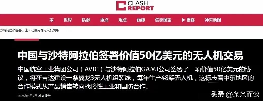 沙特是个实在人! 沙特看见波斯湾对面的伊朗被美以打了,于是急忙在3月8日和中国签署了一条年产48架翼龙3无人机合作生产线: 翼龙-3无人机绝非普通作战装备,它是实打实的战略级察打一体机型,官方公布的参数里,航程能突破一万公里,还能搭载6.5吨航弹,不管是远程巡逻侦察,还是精准打击目标,都能展现出超强的实战能力。 沙特把这款无人机的生产线落地本土,就像在家门口架起了一道坚固的安全屏障,周边海湾国家要是有非分之想,先得掂量掂量翼龙-3的威慑力,就算是万里之外的势力想挑衅沙特,也得好好算一算背后的代价。 过去沙特买军备基本都盯着欧美国家,可欧美装备不仅卖得贵,还总附加各种不合理条件,交付周期也没个准信,关键时刻根本靠不住,沙特这次选中国合作,就是看中了中方装备的实用性和合作的诚意。 这次合作不只是卖几架无人机这么简单,而是全产业链的深度协作,沙特能借着这个机会,一步步提升本土军工制造水平,刚好贴合国家发展的军工规划,中方也能借此拓展高端无人机的海外合作版图,双方都能从中获益。 中东地区向来局势复杂,各种势力博弈不断,军备力量的平衡直接关系到地区安稳,沙特引进翼龙-3生产线,既能筑牢自己的国防根基,也能平衡地区军事力量,不让外部势力随意插手地区事务。 阿条我觉得沙特这次特别务实,在乱局之中,只有手握靠谱的国防力量,才能把命运攥在自己手里,不被别国随意拿捏,这种不搞虚的、只看实际利益的做法,才是真正明智的选择。 各位读者你们怎么看?欢迎在评论区讨论。
