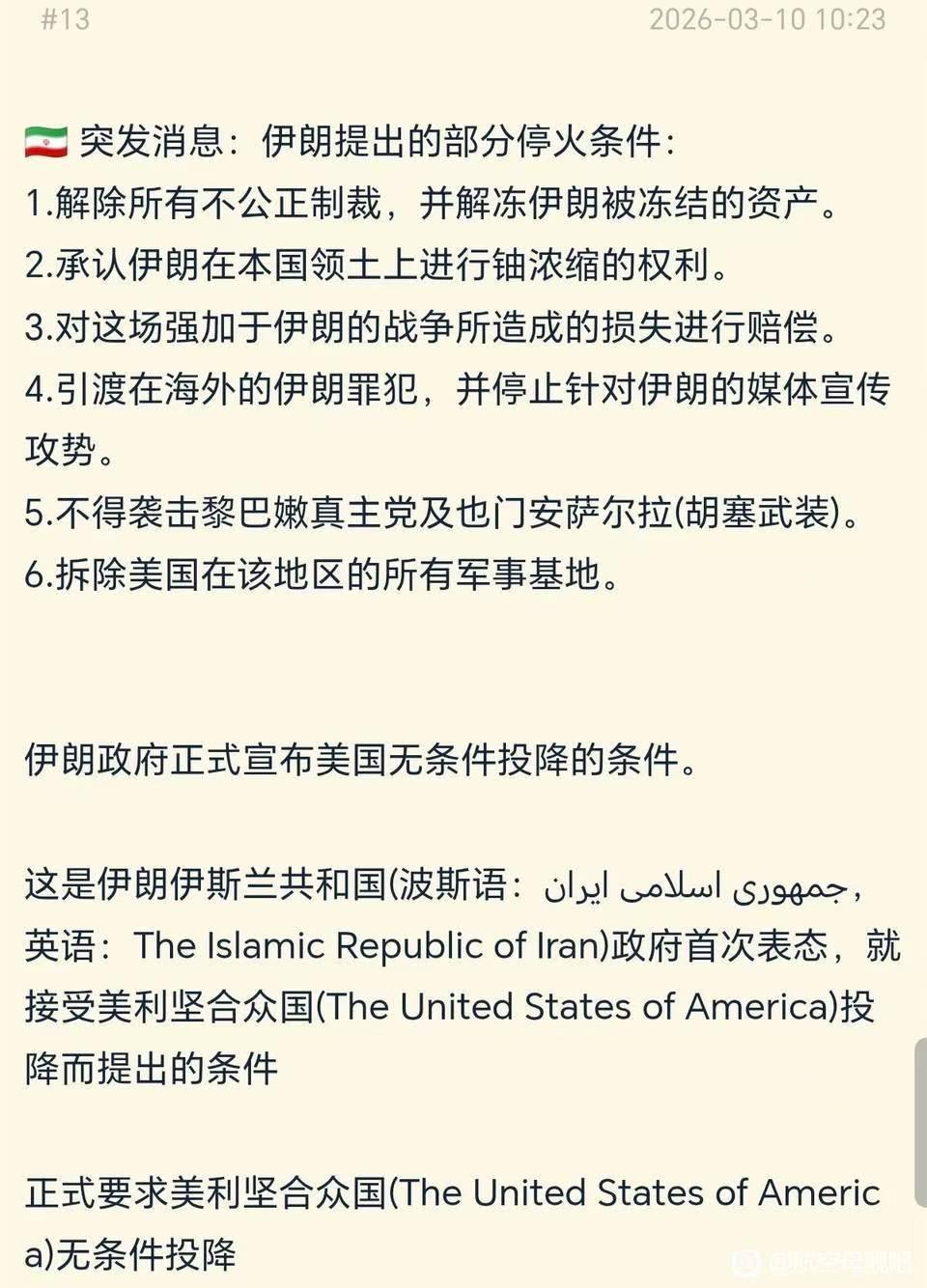 伊朗提出的停火条件,简直就像是要求美以无条件投降。目前,美以在军事方面仍占据优势,特别是在制空权上对伊朗形成压制。近期,美国对金融市场加以管控,使得市场并未因伊朗封锁霍尔木兹海峡而持续暴跌。当下,伊朗与美国对峙的关键,一是看谁能坚持得更久,二是对霍尔木兹海峡的掌控力。若未来几天伊朗无法展现其导弹能力与对海峡的掌控力,那么提出任何条件都无济于事。