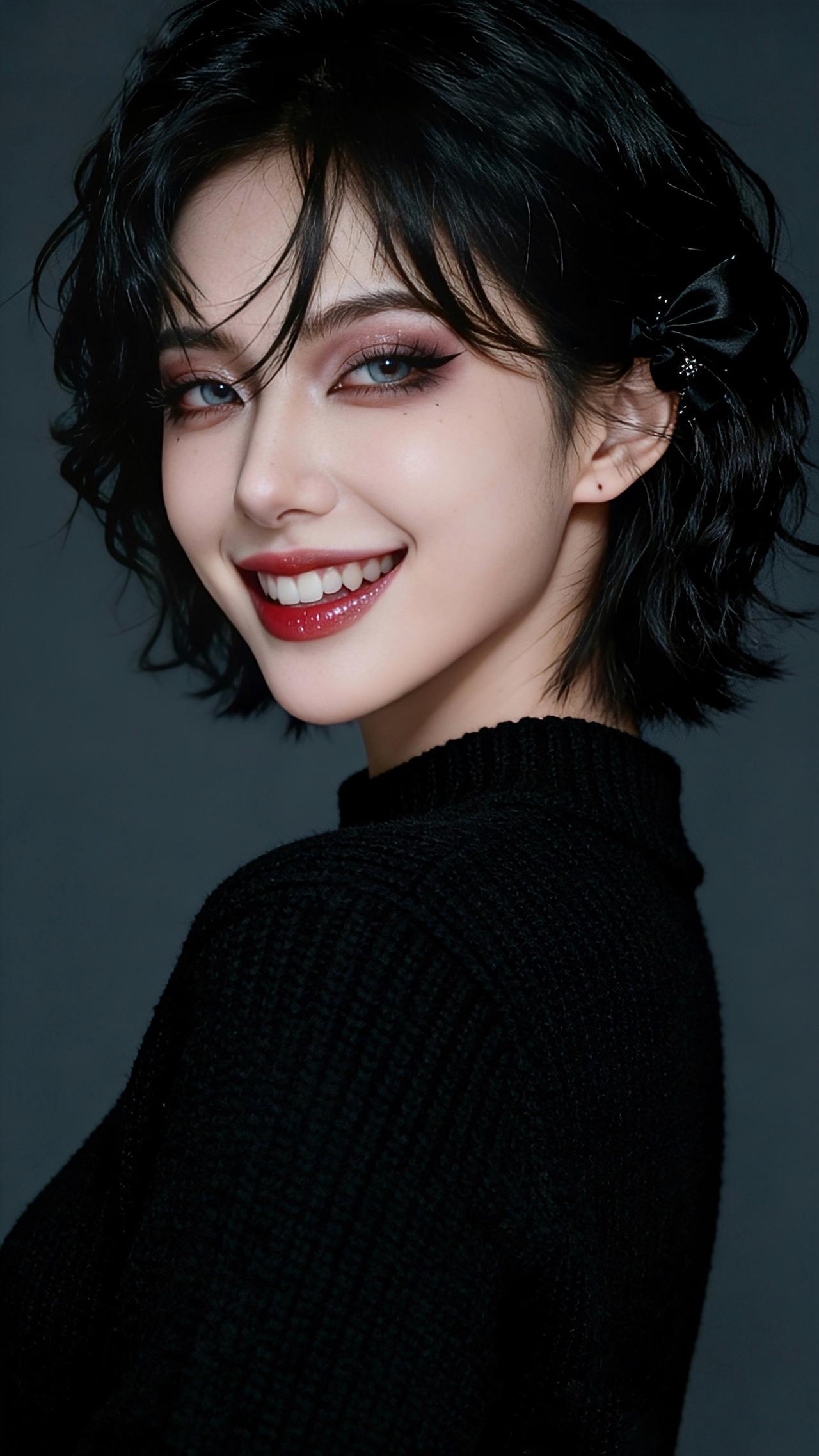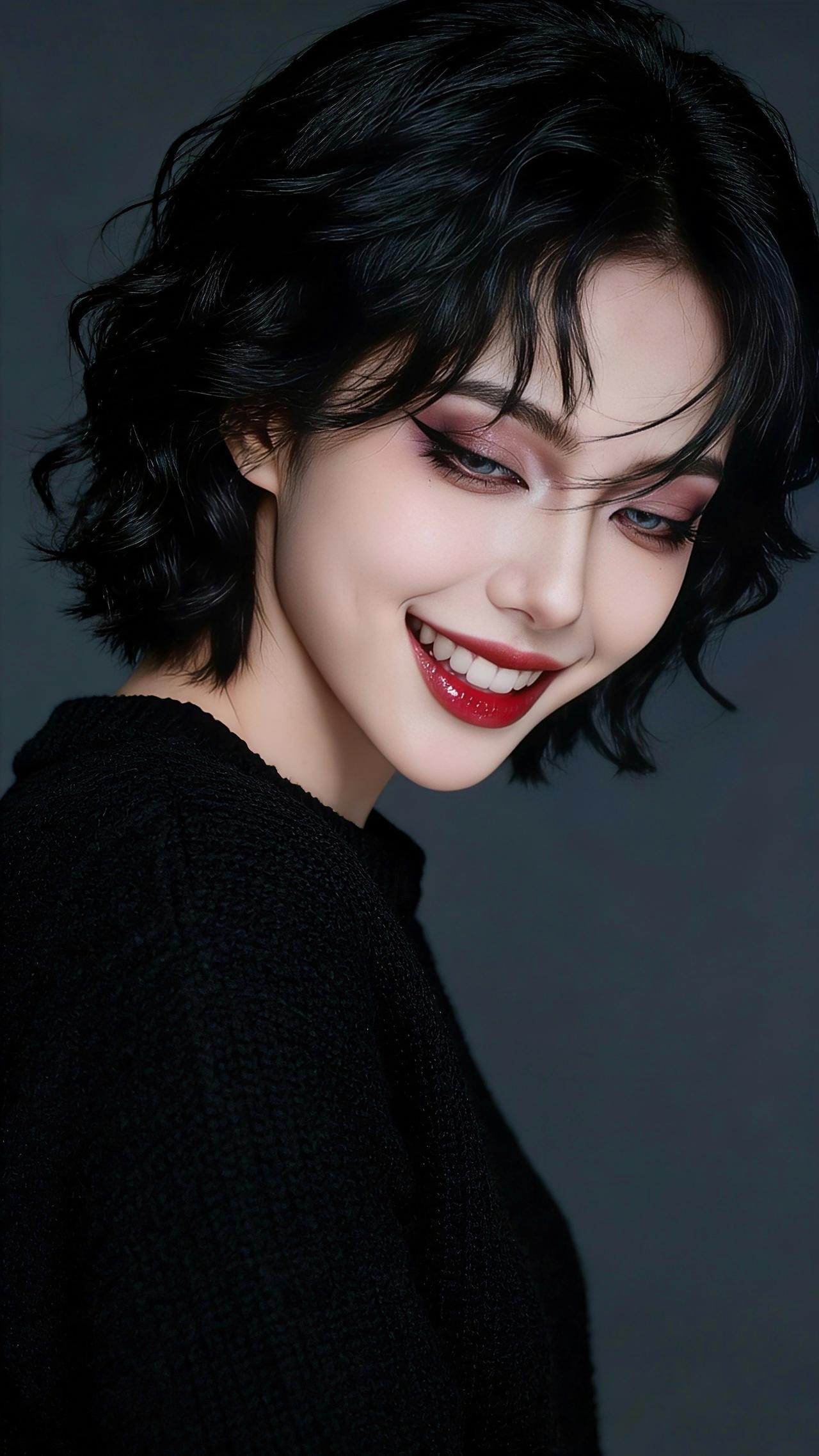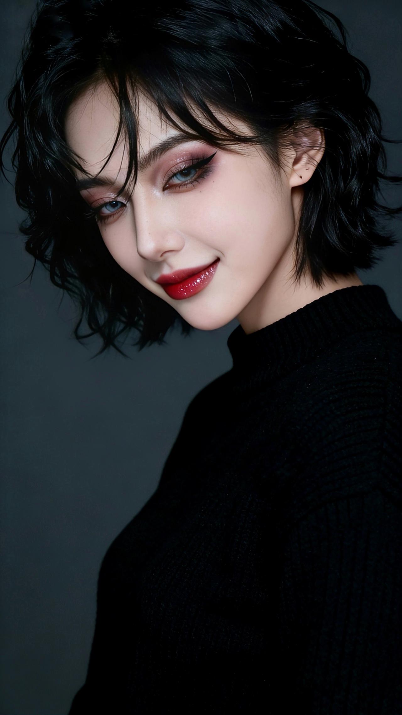 九帧同绘暗夜精灵。乌黑短卷发灵动摇曳,黑毛衣衬雪肌莹润。蓝眸藏星,粉调眼妆添妩媚,红唇似焰笑盈盈。深灰纯黑背景衬静谧,优雅温婉神秘漫帧,一眼沦陷! 图片为A l辅助完成,请注意甄别!