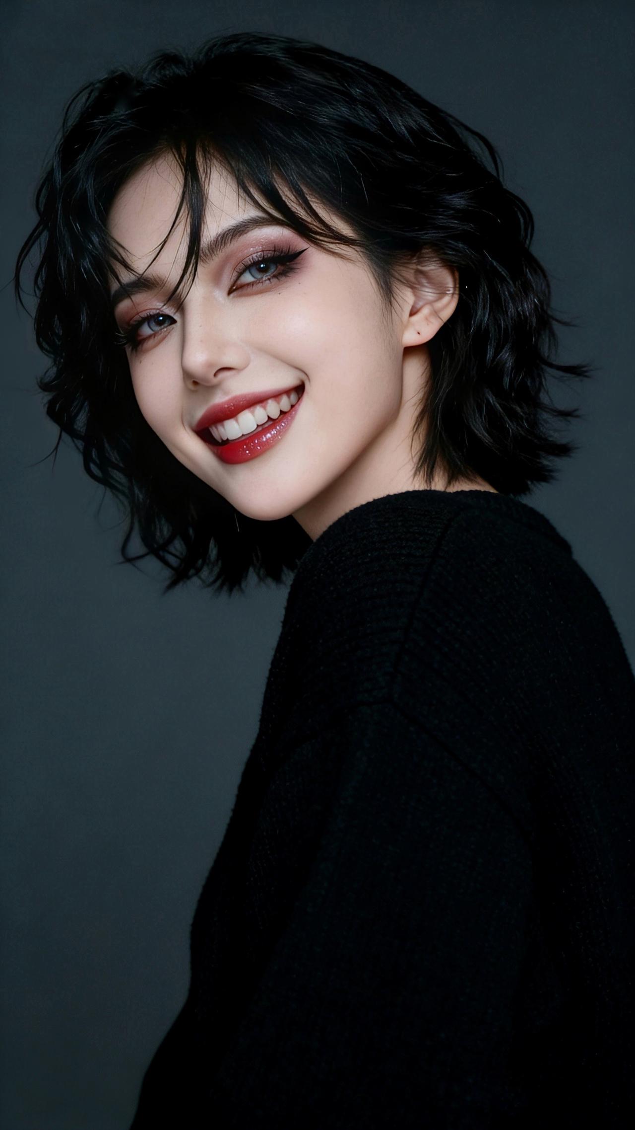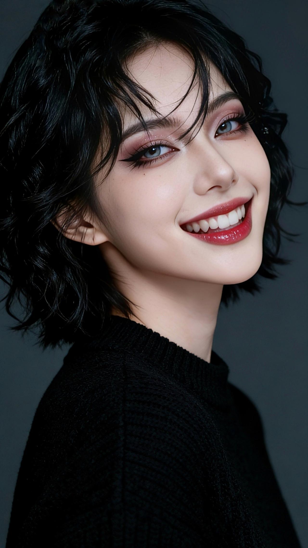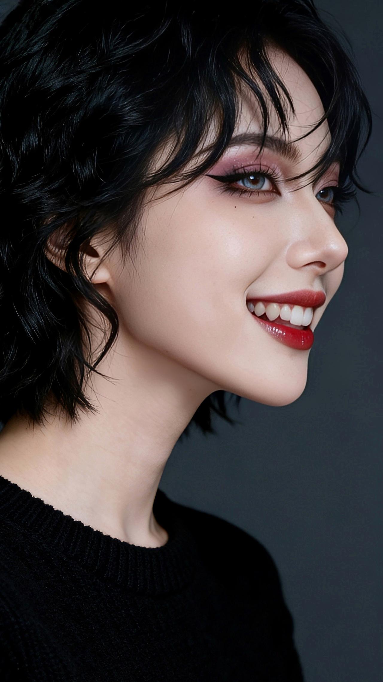 九帧同绘暗夜精灵。乌黑短卷发灵动摇曳,黑毛衣衬雪肌莹润。蓝眸藏星,粉调眼妆添妩媚,红唇似焰笑盈盈。深灰纯黑背景衬静谧,优雅温婉神秘漫帧,一眼沦陷! 图片为A l辅助完成,请注意甄别!