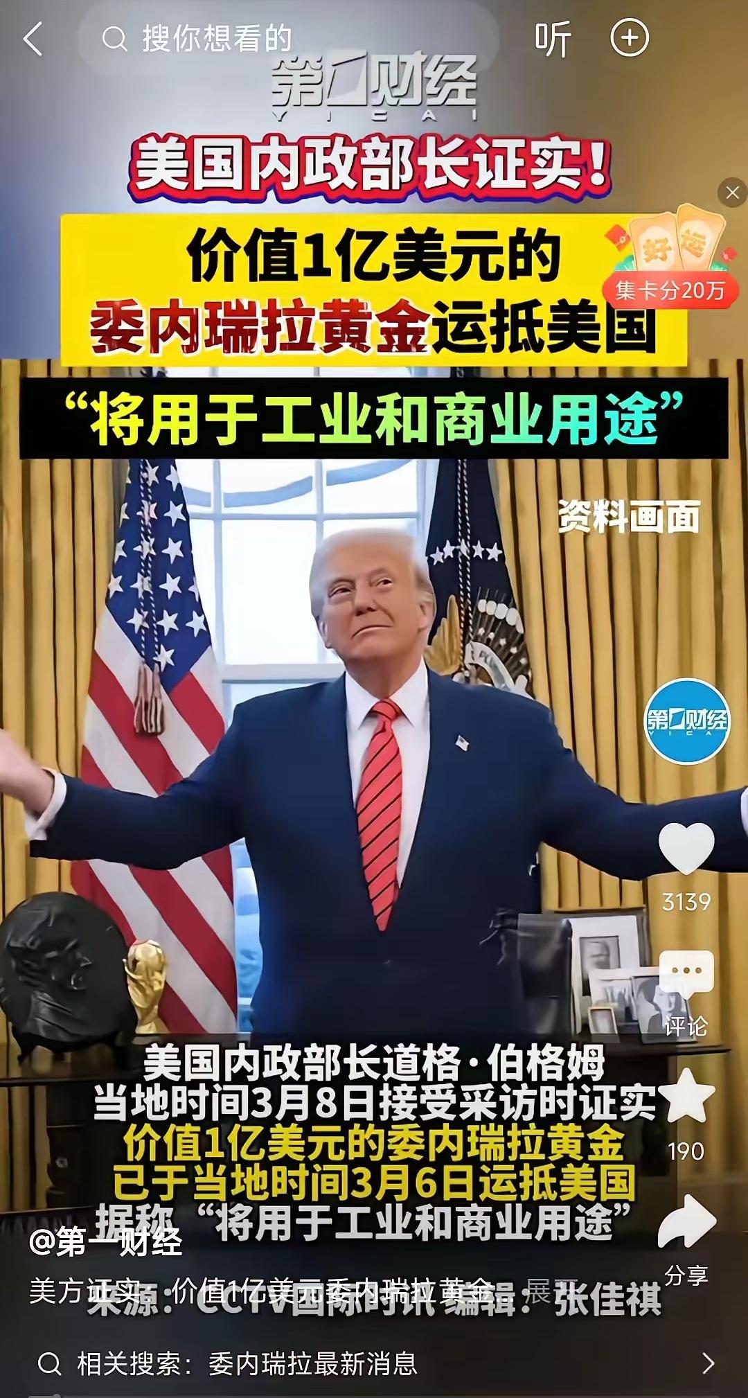 委内瑞拉在3月6日,将1亿美元的黄金运送到美国。 原来,特朗普把人家总统押走是有原因的。原来是看上了人家的石油黄金。 就在委内瑞拉前总统被美国带走之后,不久之后,委内瑞拉就将价值5亿美元的石油运输到了美国。而在3月6号,委内瑞拉的这个新选举的总统又将1亿美元的黄金运输到了美国。这下特朗普开心了。 有网友评论:美国绑架委内瑞拉总统尝到了甜头,想对伊朗依法炮制,没想到碰到了伊朗这个硬骨头! 这种小国要生存只需给特朗普家族行贿就行。 对此,你怎么看?