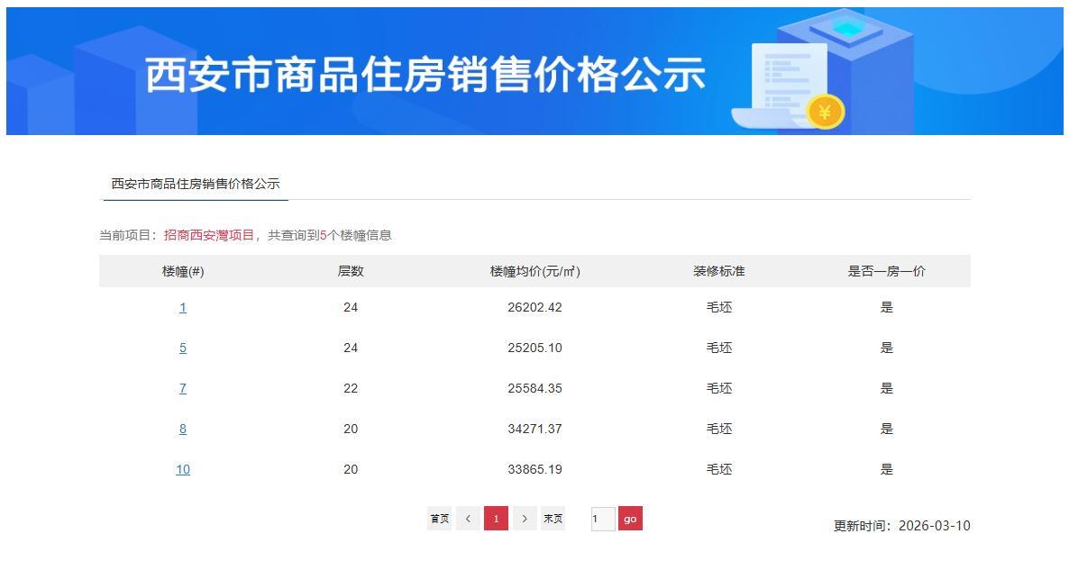 快讯!刚刚,西安住建局官公示了浐灞国际港浐灞三角洲板块纯新盘“招商·西安湾项目”首批房源的价格,均价最高34271.37元/㎡! 本次价格公示, 项目是纯新盘首次入市,公示了1、5、7、8 和 10 楼 等共5栋楼的价格,分别为24层、22层、10层的高层,建面区间约196-279㎡,楼栋均价分别为26202.42元/㎡、25205.10元/㎡、25584.35元/㎡、34271.37元/㎡、33865.19元/㎡,共175套毛坯房源。 其中,建筑面积约200㎡产品,均价2.1万元/㎡起,总价420万起;建筑面积约230㎡产品,均价2.3万元/㎡起,总价530万起;一层一户建筑面积约280㎡的产品,均价3.1万元/㎡起,总价850万起! 招商·西安湾项目位于西安浐灞国际港浐灞三角洲板块欧亚五路以北,兴泰北路以东,项目用地是招商在去年8月摘得的,占地面积约116亩,容积率仅2.0,绿化率约35%,规划了16栋20-24层高的大平层产品。 项目最大的看点就是占据一线河景,东侧紧邻灞河河岸线和广运潭公园,拥有约400米连续无遮挡观河界面;项目地势整体抬高约5米,所有楼栋都旋转了约7.5°,和灞河岸线形成最佳夹角。 北侧距离浐灞国际港第二学校和西安浐灞第十六小学约700米左右;距离南侧浐灞国际港第一学校(陕西师范大学浐灞国际港实验学校)大概在1公里左右;向东1.2公里就是西安华夏文旅度假区… 此外,项目的高端会所中,恒温泳池、私宴厅、盐疗室、录音棚、棋牌室、KTV、颂钵疗愈等丰富功能单元,会所内约400米艺术长廊的设计,把水景从社区外部“引”进内部,还引入西安首个“悬浮泳池”、露台等等设计..