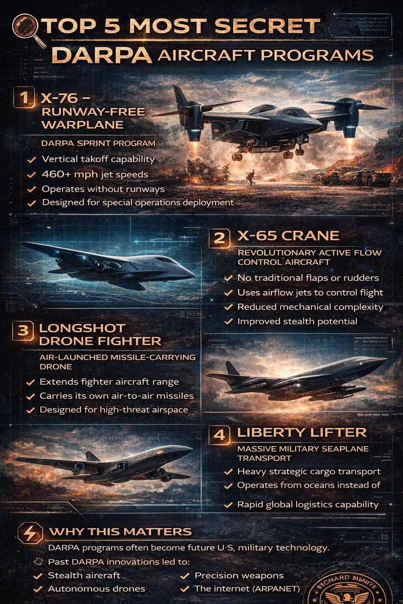 美国国防高级研究计划局(DARPA)值得关注的 5 个实验性飞机项目: • X-76 无跑道起降喷气式飞机 • X-65 无操纵面飞机 • LongShot 导弹无人机 • Liberty Lifter 巨型水上飞机 • 自主僚机无人机 今天 DARPA 的秘密项目,往往将成为明日战场上的现实。 资料来源:美国国防高级研究计划局(DARPA)|贝尔德事隆公司(Bell Textron)|《每日邮报》(Daily Mail)