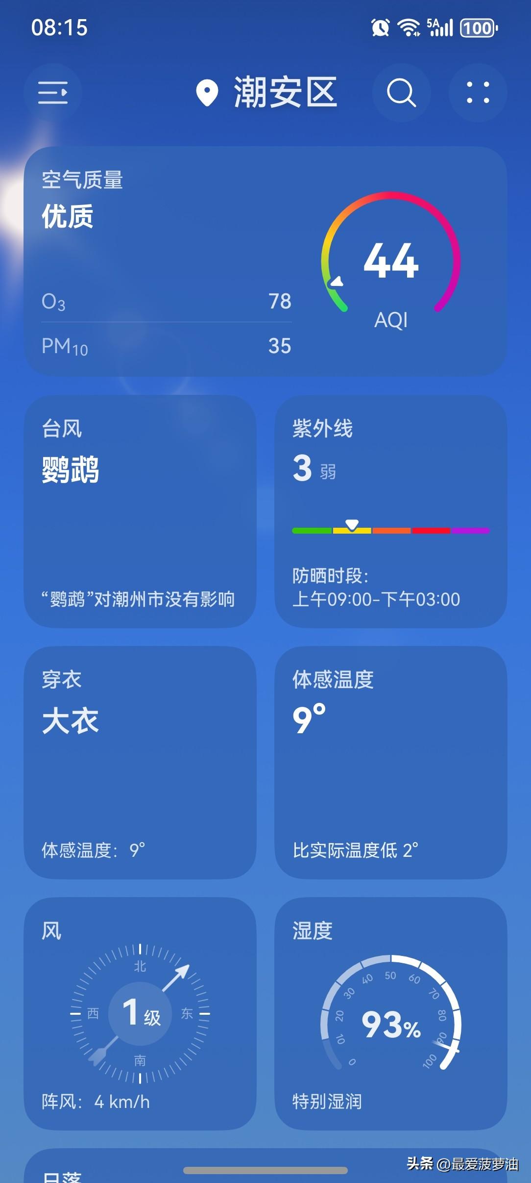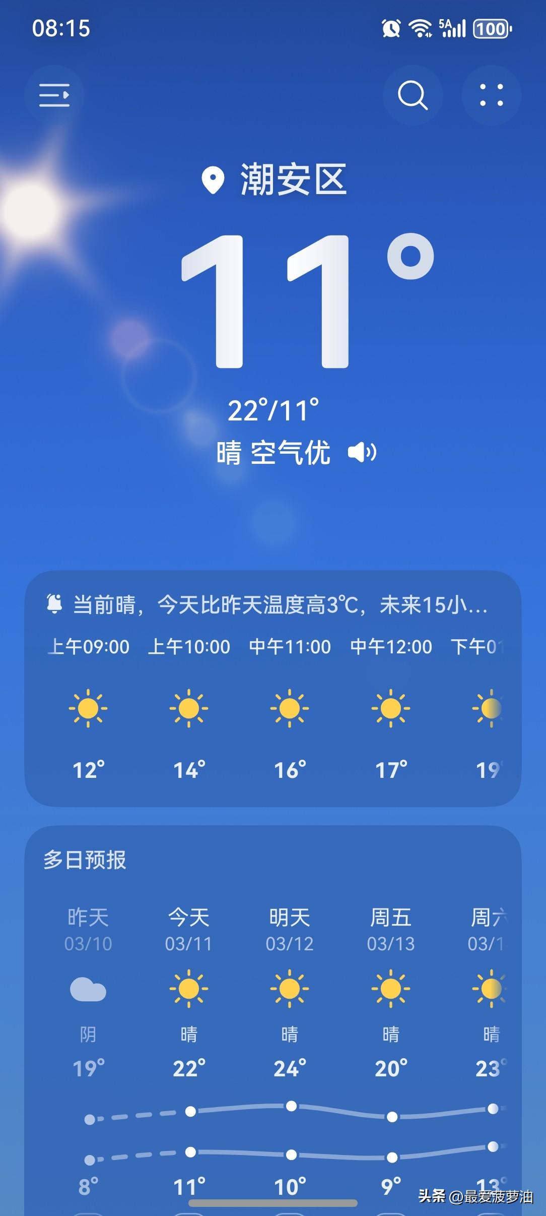 广东:阳光返场啦!喜提一波晴暖天气! 未来几天(11~13日),广东大部多云转晴,昼夜温差较大、早晚清凉。 今天(11日),潮州喜提一个大好晴天!气温11~22℃,此刻气温11℃,体感温度9℃。 一起来看看今天的天空吧!一大早太阳已经开始上线营业了,虽然早上的气温依然有点低,不过已经比昨天上升了一点点啦!有了阳光的加持,气温上升会比较快的。 接下来的几天,阳光一直在线!看来,这波晴暖天气是稳了。 近期的天气变化节奏实在是太快啦!气温也是忽高忽低的,大起大落,确实非常符合春天气候的特点啊! 虽说春季气温已经回暖,但仍然有冷空气频繁来袭,气温波动幅度较大。小伙伴们需要注意根据温度变化适时增减衣物,别让感冒病毒有机可乘! [捂脸][福][赞][赞][捂脸][福][送自己一朵花][赞]