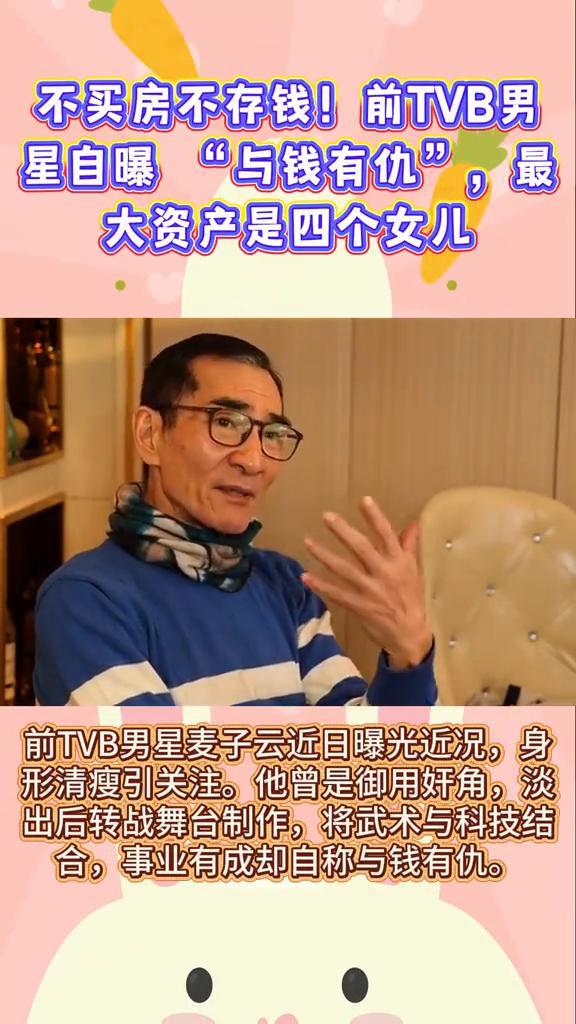 不买房不存钱!前TVB男星自曝"与钱有仇",最大资产是四个女儿。 前TVB男星麦子云近日曝光近况,身形清瘦引关注。他曾是御用奸角,淡出后转战舞台制作,将武术与科技结合,事业有成却自称与钱有仇。 麦子云不买房不存钱,视四个女儿为最大资产。他坚信培养子女成才胜过物质积累,从荧幕恶人转为慈父,展现顾家好男人的真实一面。