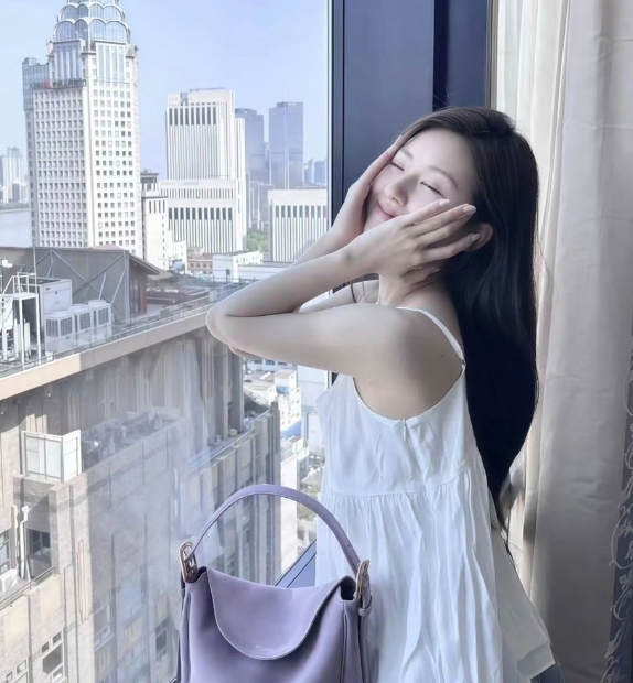 刘亦菲这条裤子挺养生,毕竟降温了肚脐眼必须护住啊