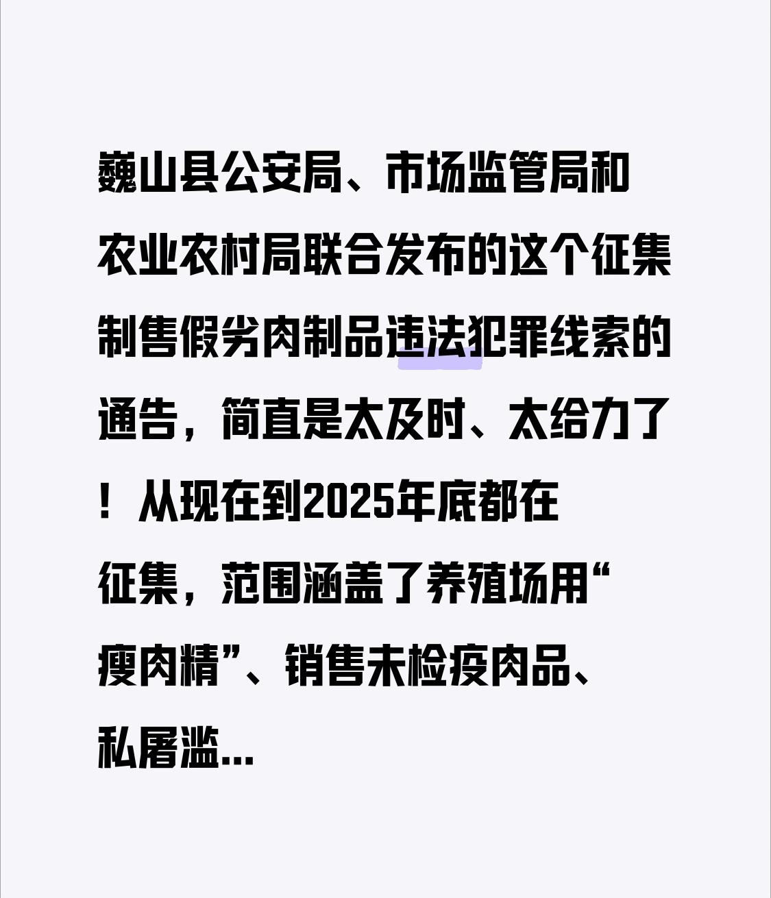 巍山县公安局、市场监管局和农业农村局联合发布的这个征集制售假劣肉制品违法犯罪线索的通告,简直是太及时、太给力了! 从现在到2025年底都在征集,范围涵盖了养殖场用“瘦肉精”、销售未检疫肉品、私屠滥宰,还有拿鸡鸭猪马肉冒充牛羊驴肉等情况。 这些假劣肉制品就像隐藏在我们身边的“健康炸弹”,严重威胁着我们“舌尖上的安全”。之前就有新闻报道过,有人吃了含“瘦肉精”的肉后身体不适。所以这次行动必须点赞!大家要是发现线索,别犹豫,赶紧举报。相信在大家的共同努力下,市场会更干净,我们也能吃得更放心!