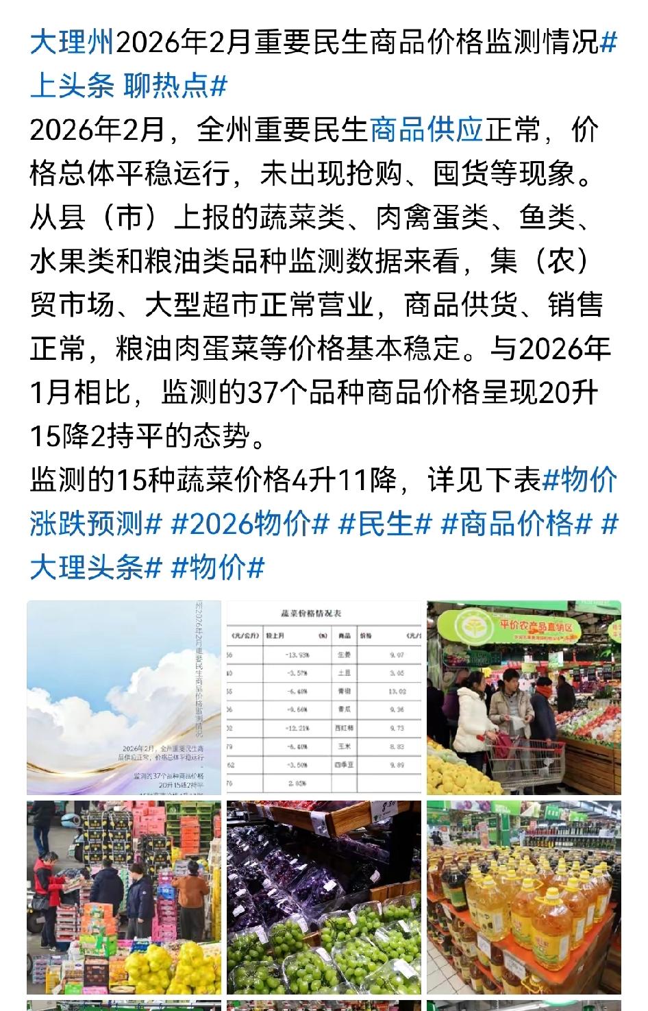 2026年2月大理州的民生商品情况挺让人安心的。[心] 全州重要民生商品供应正常,价格也总体平稳,没出现抢购、囤货这些乱子。这说明当地的物资调配和市场监管做得不错。 就拿日常生活中常见的米面粮油来说,价格稳稳当当,不会让老百姓有太大的经济压力。蔬菜、水果的供应也跟得上,种类丰富。这种稳定的市场环境,让大家能更从容地过日子。希望之后也能一直保持这样的好状态,让民生商品价格持续平稳,大家生活更舒心。