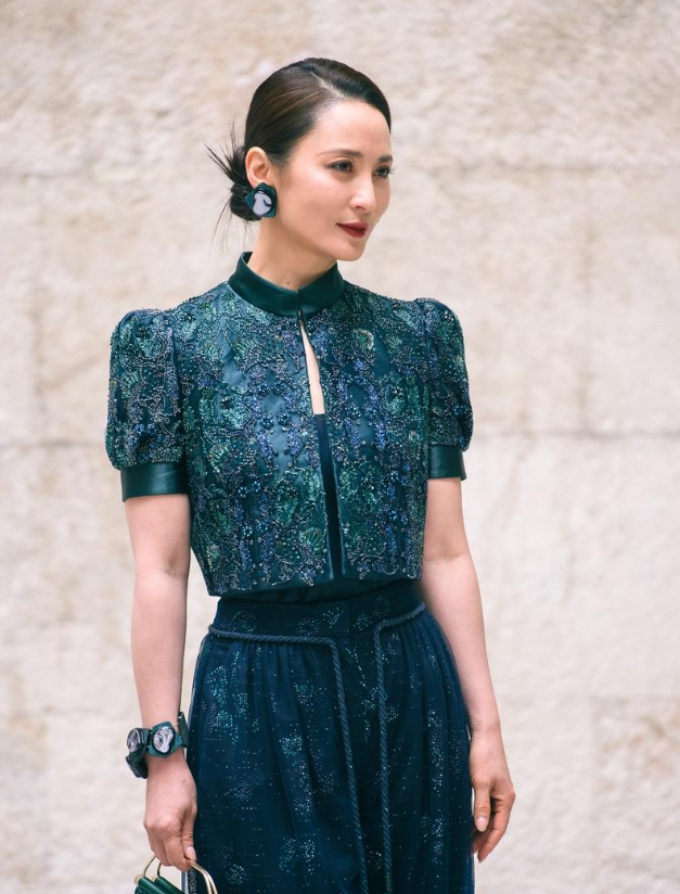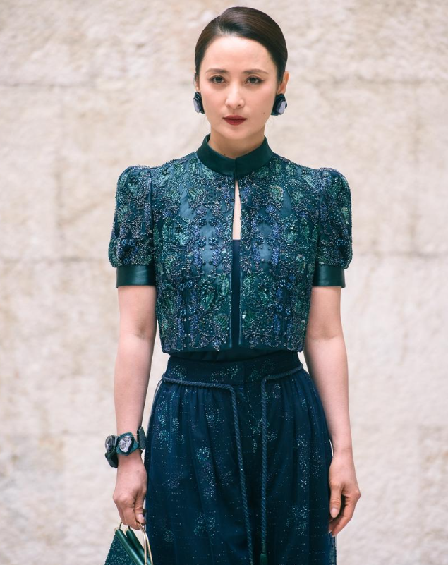 蒋勤勤上身穿上了镶嵌着古典纹样的短上衣 下身搭配漂亮的纱裙,不仅彰显出了很好的身材比例 她这次大秀细腰,越变越苗条了,还很有吸引力,不得不说蒋勤勤这次的搭配效果确实是太完美了 蒋勤勤特意把头发挽了起来,还画着精致的妆容,戴着奢华的耳坠,看上去越来越迷人了 她这回虽然穿深色的衣服,有种低调的奢华之美,总的来看蒋勤勤确实是个不老女神,也很有国际范儿,还很有艺术风采