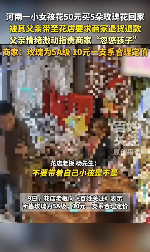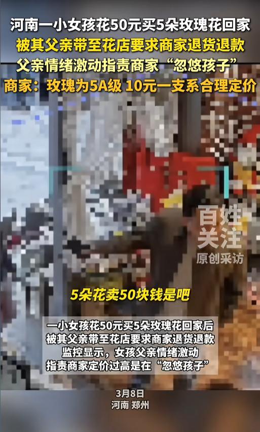 “丢人丢大发了!”3月8日,河南郑州,一个小女孩花50元买了5朵玫瑰花,带回家送给了妈妈。没想到爸爸却嫌贵,带着她去往花店理论,要求店家退货退款,甚至还扬言要让花店开不下去。店主报警后,爸爸被警察带走。网友:得,这回老实了! 节日期间,孩子用自己攒的零花钱,给父母买点小礼物,想表达一下自己的感情,也是想要让父母开心一下。有的父母欣然接受,还不忘表扬孩子;有的却收下后却责备孩子乱花钱;还有的,直接带着孩子去退货退款,全然不顾孩子的感受。 据媒体报道,事发当日,正值妇女节。小女孩就在花店花50元钱买了5朵A级玫瑰,带回家,当节日礼物送给了妈妈。 没想到女孩的爸爸看到后,就问她花了多少钱,一听花了50元,瞬间炸了,带着女孩就去了花店。到了店里,女孩的爸爸大声斥责,说店主忽悠小孩,甚至扬言要让花店开不下去。 小女孩在一旁吓得畏畏缩缩,不敢搭话。她爸爸还拿出手机拍起视频来,嘴里各种花店的不是。店主一看他无理取闹,就打电话报了警。 事后店主回应,A级的玫瑰花,十块钱一朵就是市场价,又不存在欺诈,也没有强买强卖。退货也不是不行,50块钱也无所谓。可孩子父亲没必要带着孩子过来,又是辱骂又是威胁的,还聚集了一群人大喊大闹。店主自己也被弄得很生气。 网友看后表示,就为了50块钱,这么撒泼打诨的,孩子怕是要有一辈子的心理阴影了。要是觉得孩子花了冤枉钱,告诉她以后不要买这么贵的了就好,或者到店里跟人家好好沟通,问问行情。这么做是把自己当老天爷了,还是把自己当土匪了! 信息来源:《小女孩花50元买5朵玫瑰花回家,被父亲带至花店要求退货退款。》百姓关注