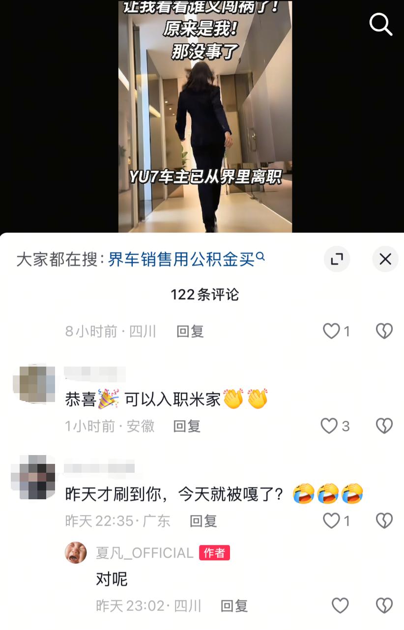界里挣钱买粗粮 “闯祸”小姐姐自曝被“开除” 界里打工给YU7还贷的销售小姐姐,在某自媒体平台自曝已离职。 开着丰田卖大众、开着本田卖通用的销售们,此刻瑟瑟发抖。【来自懂车帝车友圈】