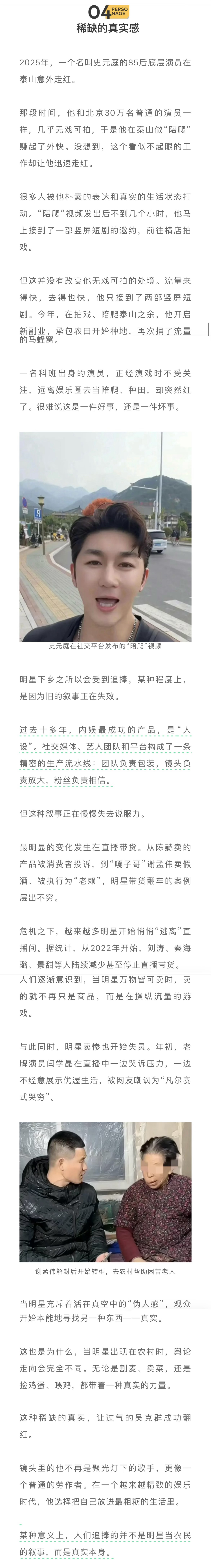 当明星充斥着活在真空中的“伪人感”,观众开始本能地寻找另一种东西——真实。 这也是为什么,当明星出现在农村时,舆论走向会完全不同。