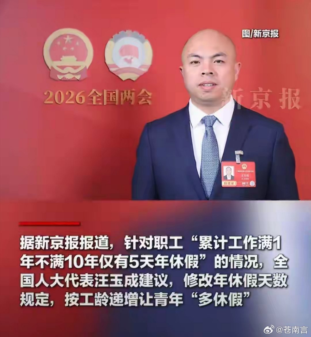 工作不满10年休5天年假规则该调整工作不满10年仅休5天年假的规则,正成为代表委员聚焦的热点。2026年全国两会上,多位代表建议调整现行年假制度,让劳动者的休息权与消费能力同步提升 。现行《职工带薪年休假条例》自2008年施行以来,工作满1年不满10年的职工年休假仅5天、满10年不满20年10天、满20年15天 。如今青年劳动者已成为职场中坚,5天年假难以满足旅游、陪伴家人等实际需求,与社会发展节奏脱节 。辽宁大学校长余淼杰代表提交建议,提出将最低法定年假从5天提高到10天,并允许未休年假两年内结转使用。同时明确休假不影响绩效晋升,对年假使用率低的企业加强监管,从根源扭转"不敢休、不愿休"的局面 。另有代表建议按工龄递增,首两年5天后逐年加1日至10日,更贴合青年需求 。人社部已明确推动修订《职工带薪年休假条例》,落实带薪错峰休假被写入政府工作报告 。假期扩容不仅保障劳动者权益,更能激活消费潜力,让大家有时间、有能力享受生活 。