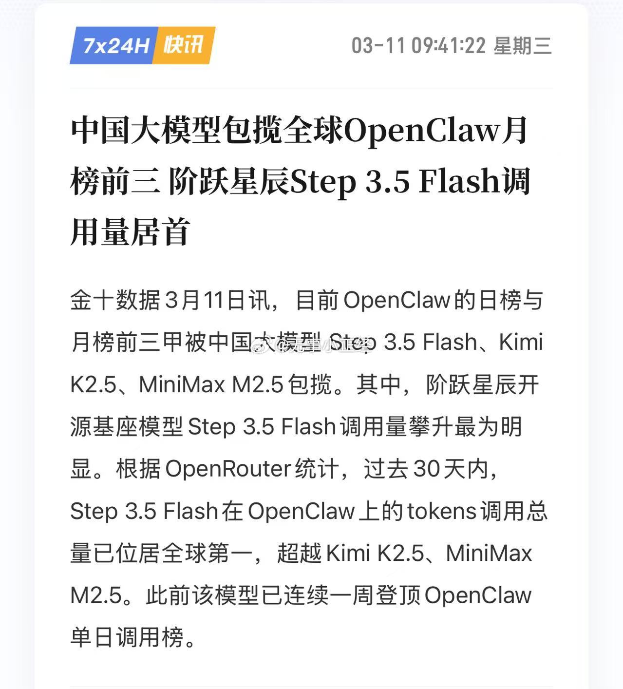 中国大模型包揽全球OpenClaw月榜前三 阶跃星辰Step 3.5 Flash调用量居首