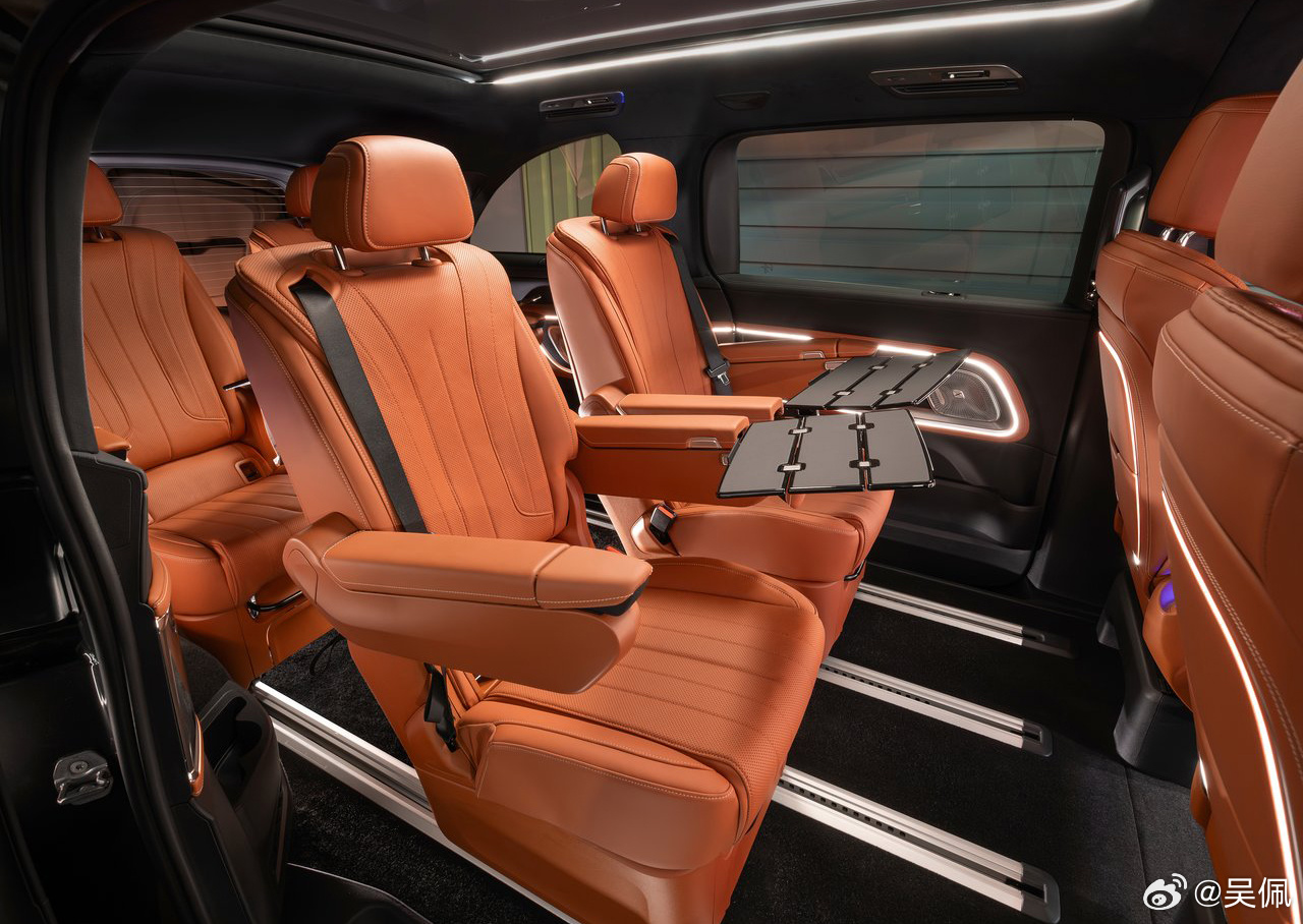 换代奔驰V Class这回把豪华干得非常彻底了,哦,现在叫奔驰VLE了,直接干成了纯电,115度电池700km续航,带上下40mm调节空悬+双向各7度后轮主动转向,有5座但最多去到三排8个座位。
