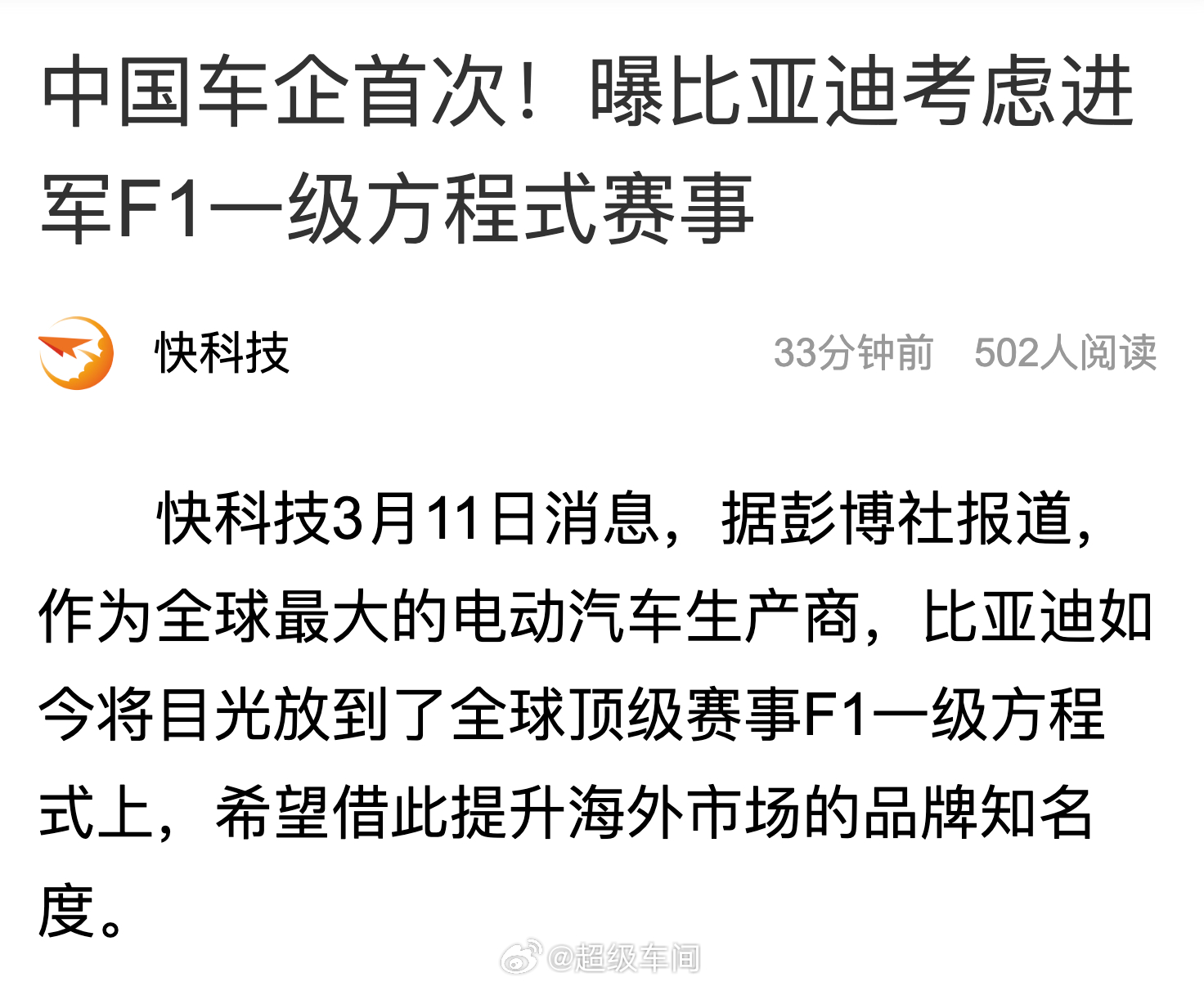 刚刚看到新闻:比亚迪正在评估进军F1,可能是自建车队,也可能是收购。