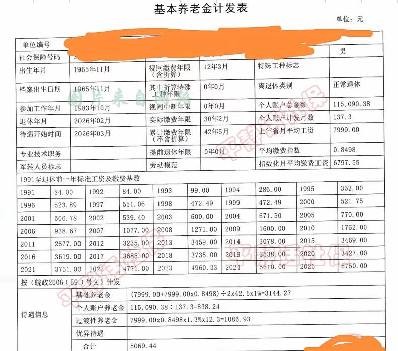 安徽养老金! 安徽省养老金核定表有两种,这是其中一种。 男性,1965年11月生人,2026年2月退休,延迟了3个月,1983年10月参加工作,到1996年统账结合,有12年3个月的过渡性养老金计算年限。累计缴费42年5个月,个人账户本息累计11.51万,指数0.8498。 养老金核定结果: 基础养老金3144.27元 个人账户养老金838.24元 过渡性养老金1086.93元 以上三项合计5069.44元。 平均工龄单价119元/年。 大家仔细看下基础养老金的年限,缴费42年5个月但表上是42.5,而不是42.42年,这是安徽的福利。 月份只进不舍,42.42年进位后是42.5,也就是说,年限尾数5个月和6个月在计算时是一样的。