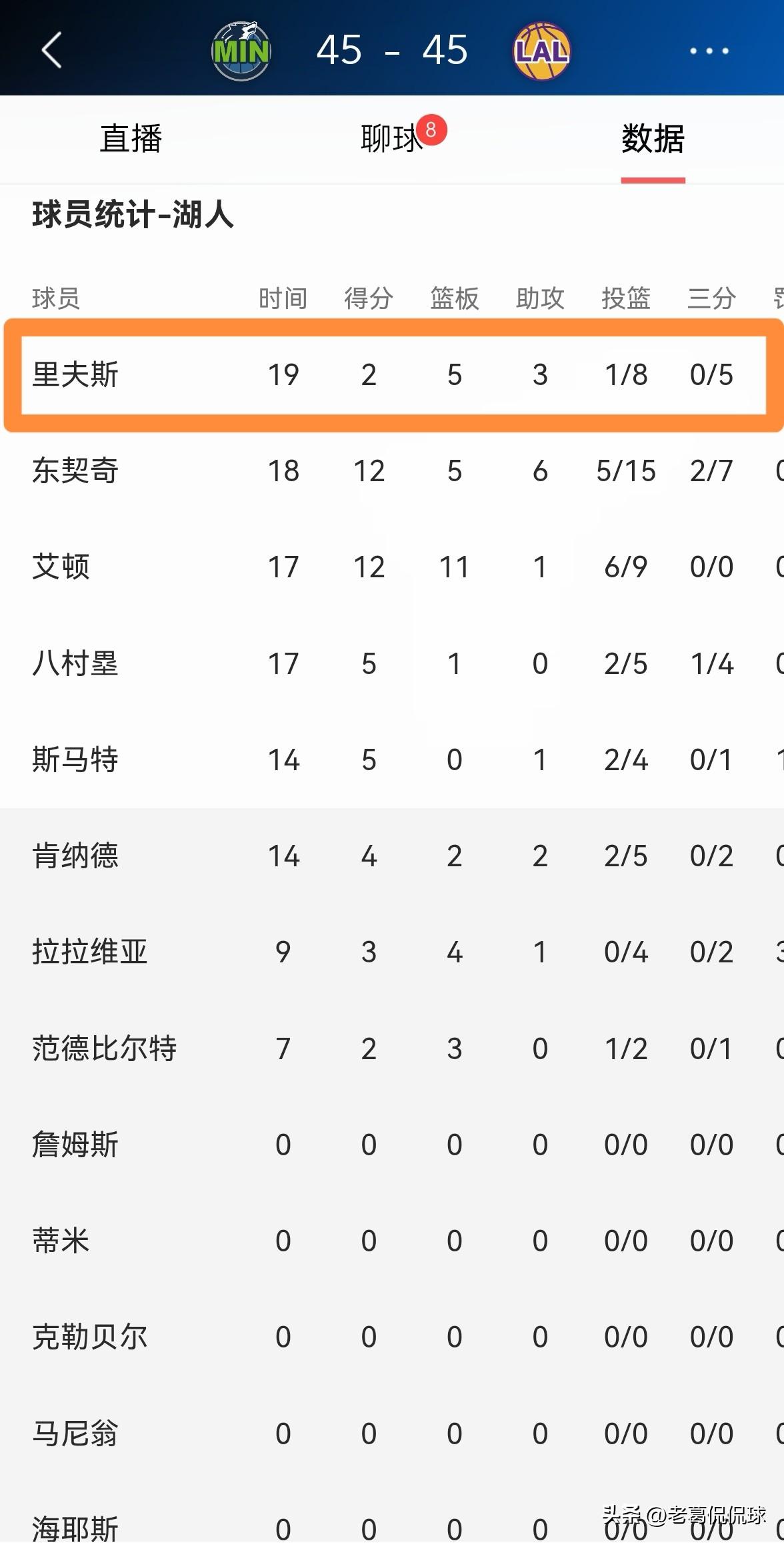 湖人三当家里弗斯真是一个大笑话!在今天湖人主场迎战森林狼的比赛中,目前双方半场战罢,两队战成了45平。在前两节比赛中,里弗斯的进攻状态真是极其的低迷,他在首发出战的19分钟里,投篮8中1,其中三分球5中0极其低效的得到可怜的2分,还有1次失误和1次犯规。 作为当今联盟最出色的得分手之一,里弗斯在上半场比赛中的表现简直就是一场灾难,他成为了全场的大笑话。