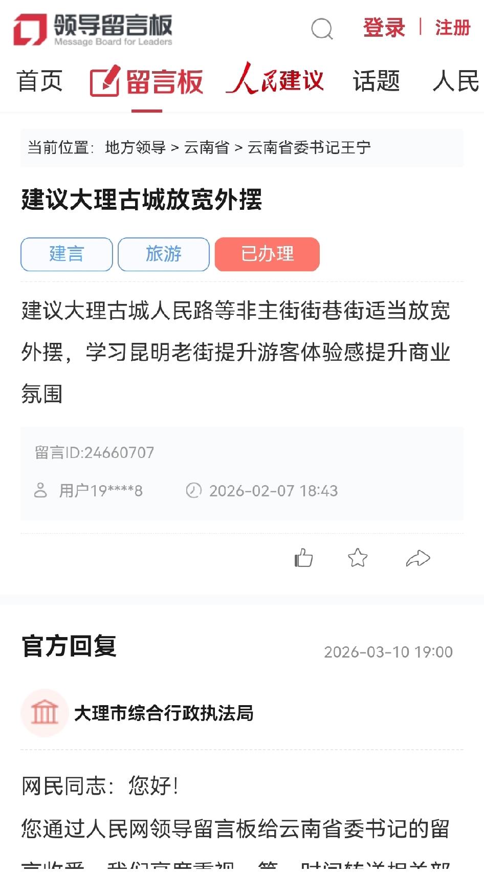 网民建议“大理古城人民路等非主街街巷适当放宽外摆”的问题❓官方回复➡️ 2月7日大理网民通过人民网领导留言板给云南省委书记留言: 📍✍📩建议大理古城放宽外摆 建议大理古城人民路等非主街街巷街适当放宽外摆,学习昆明老街提升游客体验感提升商业氛围 📍📢☎️2026-03-10 19:00 大理市综合行政执法局官方回复 网民同志:您好! 您通过人民网领导留言板给云南省委书记的留言收悉,我们高度重视,第一时间转送相关部门开展调查核实,现将办理情况回复如下: 关于您建议“大理古城人民路等非主街街巷适当放宽外摆”的问题,经大理市综合行政执法局核实,大理古城已列为国家级历史文化名城核心区,它是历史文脉、民族记忆的重要载体,是保护不可再生的历史文化遗产,其保护与管理需严格遵循《历史文化名城名镇名村保护条例》《云南省大理白族自治州大理历史文化名城保护条例》等法规执行。经了解昆明老街定位为都市中心近代历史文化街区,其保护价值侧重市井烟火沉浸,修旧如旧、活化利用为主。 另外,大理古城街巷空间有限,尤其是人民路等非主街区域,建筑密度高、通道狭窄,若放宽外摆经营,易导致私搭乱建、占用公共空间、破坏传统街巷肌理等问题,直接影响古城整体历史风貌的完整性与真实性。同时,近年来随着旅游业的发展,大理古城吸引大量摊贩摆摊设点、临街商户超店面、车辆乱停乱放等乱象问题,严重影响了旅游品质和城市形象。 自2024年7月启动的古城及周边区域综合整治行动。通过阶段性整治工作,现古城综合环境秩序已得到显著提升和改善,也得到了古城居民群众、商家商户及游客的高度好评。若现在放宽外摆限制,允许占道经营、超店面外摆经营,可能引发无序扩张,进一步压缩公共通道,加剧消防、交通安全隐患等问题,这与保护古城历史文化遗产“保护优先、合理利用”的原则不相符。 针对大理古城提升游客体验感与提升商业氛围的问题上,关键在于优化业态布局、挖掘文化内涵、创新消费场景。接下来,我局将建立更加科学规划、严格执法、精细化管理的基础上,积极探索、摸排、研判古城中后期发展相配套管理机制建设,努力实现“古城保护”与“合理利用”间寻找平衡,不断提高群众的满意度和广大游客的体验感。 感谢您对我们工作的理解和支持,祝您身体健康,生活愉快!