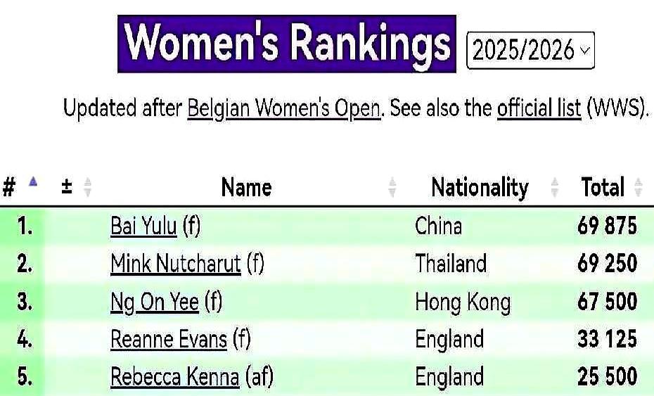 白雨露刚坐上女子斯诺克世界第一的位置,连睡觉都不敢踏实。 她刚在保加利亚WSF锦标赛4比0横扫吴安仪,拿了第八个排名赛冠军,直接断了泰国选手努查鲁特两年多的世界第一垄断。 现在她总积分69875,只比第二名多625分,也就一场排名赛的积分差,下周英国公开赛打完,说不定位置就得换。 从去年八月到现在她拿了39场连胜,这次锦标赛从小组赛到决赛一局没丢,半决赛还轰出单杆131分破了赛事纪录。 登顶靠的是一杆一杆拼,守位靠的是一分一分攒,竞技体育从来没有一劳永逸的王座。