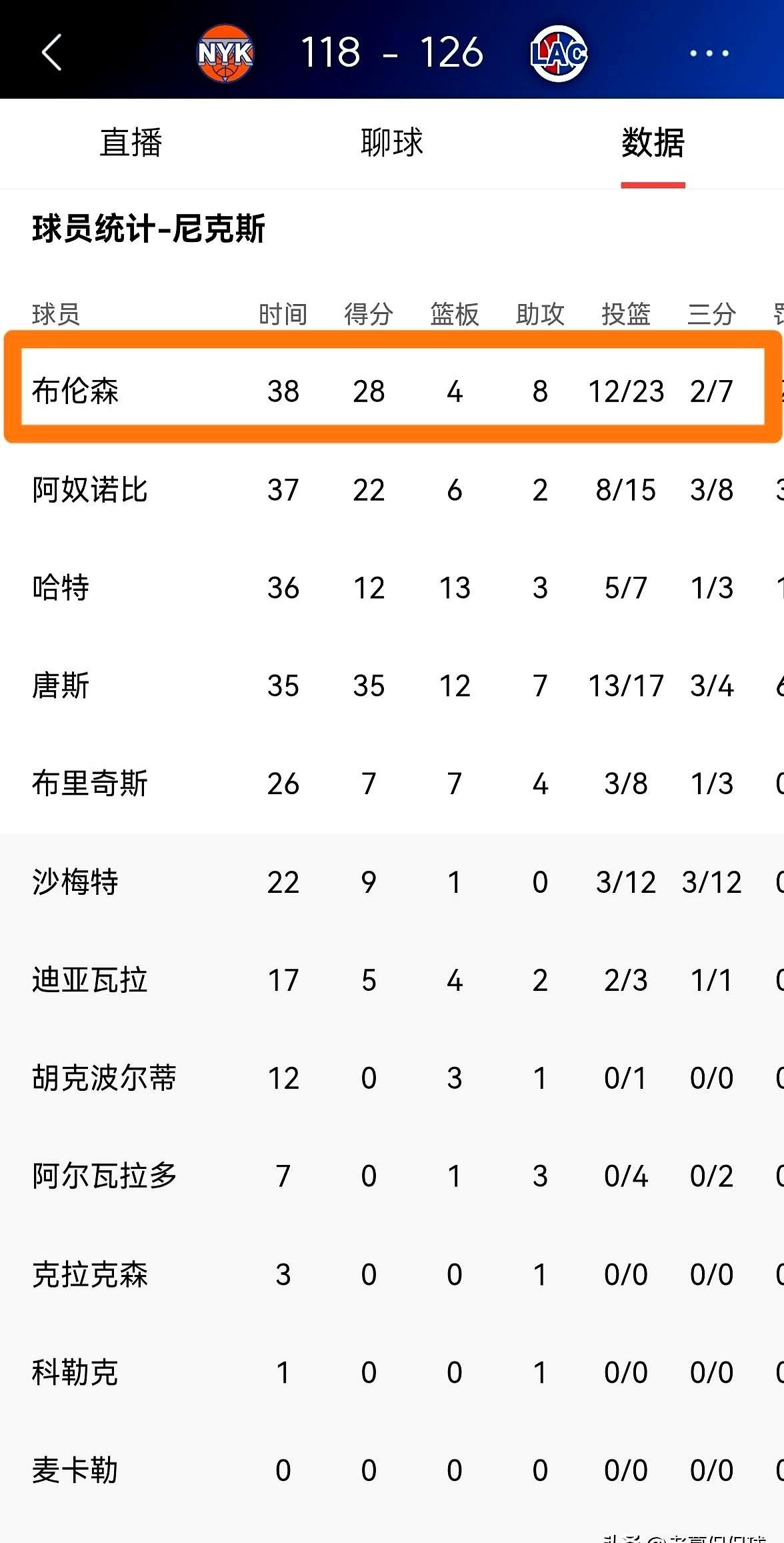 布伦森的数据再漂亮有什么用?球队还不是输了。 客场打快船,他23投12中砍下28分8助攻,正负值甚至是正的。但一看比分,118:126,尼克斯输得明明白白。数据好看,赢不了球,这本身就是最大的问题。 问题出在哪?看看唐斯。全场轰下35分12篮板7助攻,效率高得吓人。可很多时候,球都到不了他手里,只能眼睁睁看着布伦森一次又一次地单打。这不是化学反应,这是资源浪费。 连前尼克斯球员JR·史密斯都公开点名了,这俩核心的球权分配不解决,球队上限就锁死了。东部前列的战绩,根本经不起季后赛的考验。 有时候,最好的助攻不是传球,而是让权。